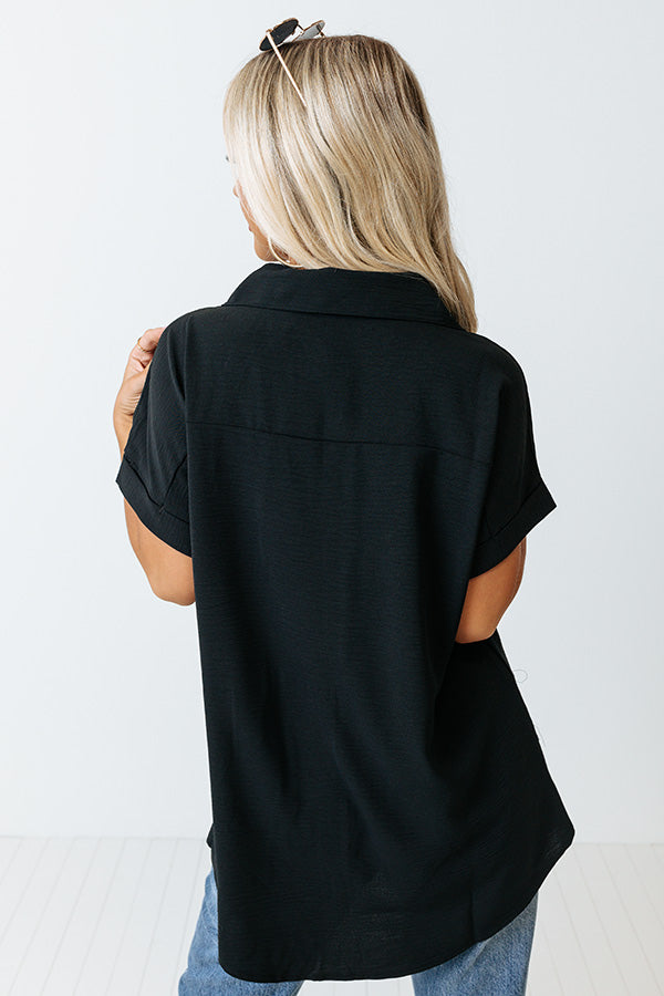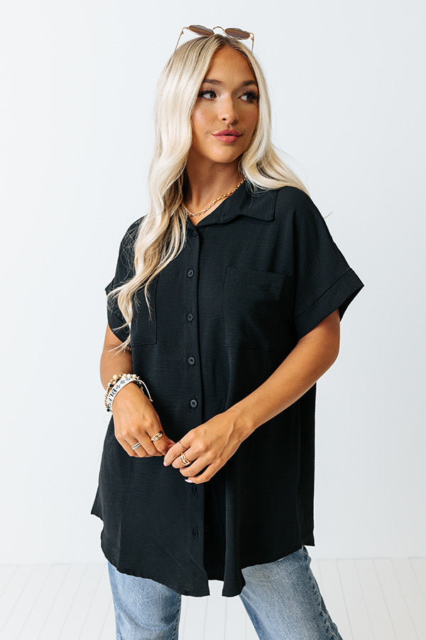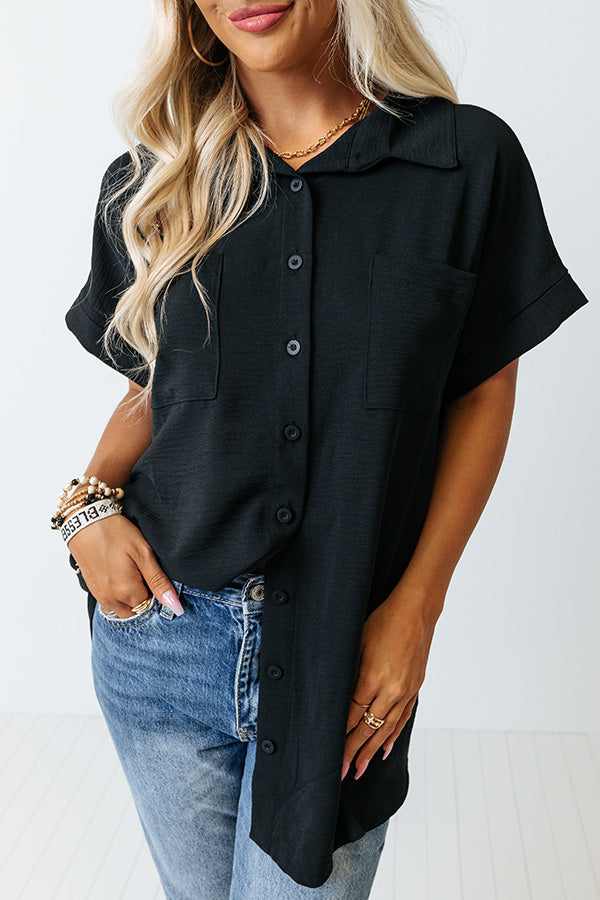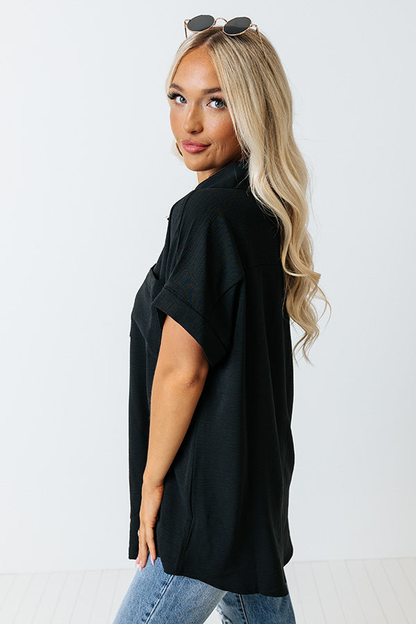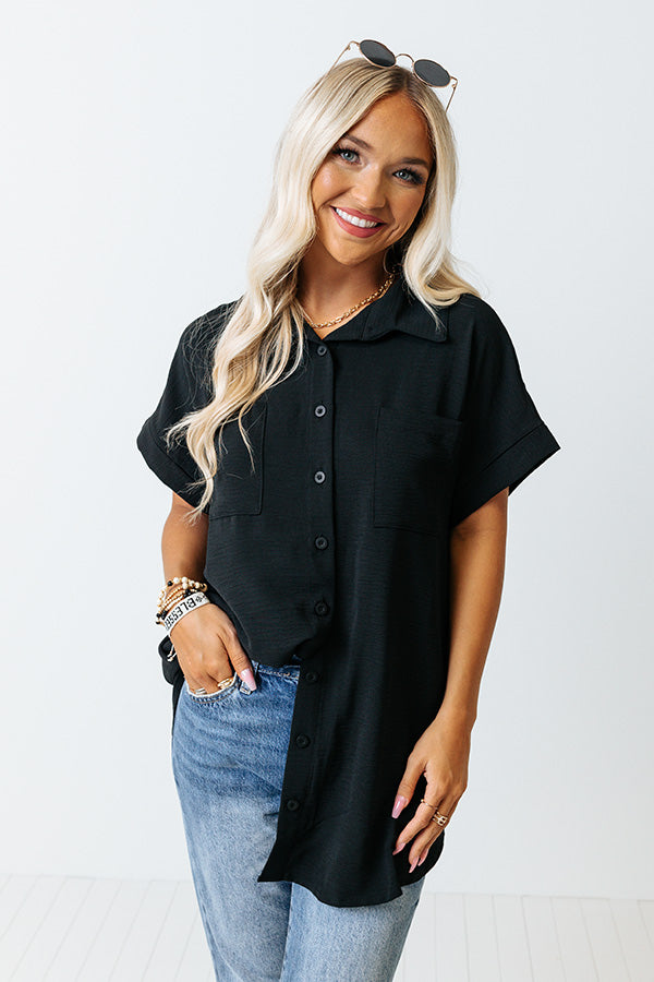 Keep your look casual in our simple but stylish black 'Cooler Waters' top featuring lightweight subtly textured material, a button up front with a collared neckline, short sleeves with rolled cuffs, two accent chest pockets, and a relaxed silhouette that ends in a rounded hemline! on products