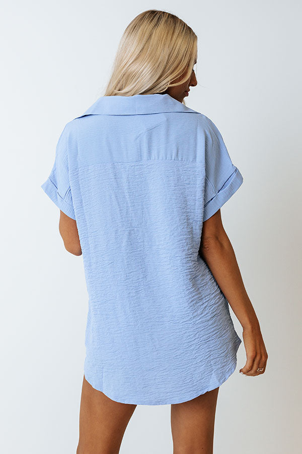 Keep your look casual in our simple but stylish sky blue 'Cooler Waters' top featuring lightweight subtly textured material, a button up front with a collared neckline, short sleeves with rolled cuffs, two accent chest pockets, and a relaxed silhouette that ends in a rounded hemline! on products
