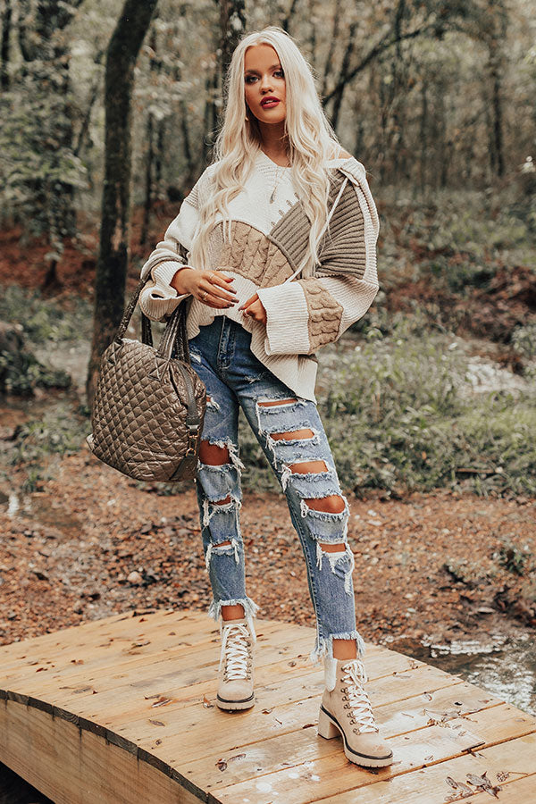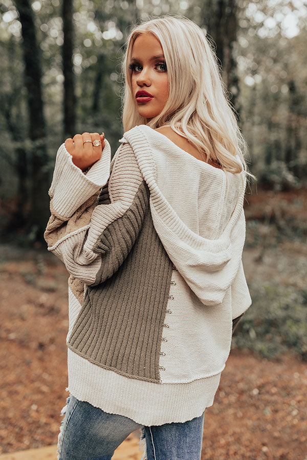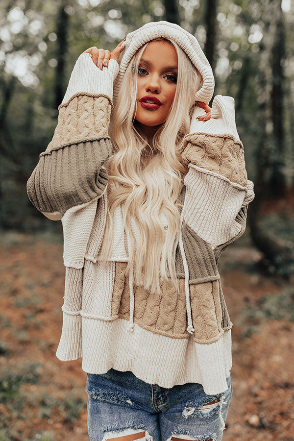 As the weather is "cooling down," heat up your style with this unique hoodie featuring soft and thick tight knit material with neutral hued cable knit and sage colored ribbed color block patches, long oversized sleeves, a wide v-cut neckline with a drawstring hooded back, and an ultra relaxed silhouette that falls into a straight hemline!