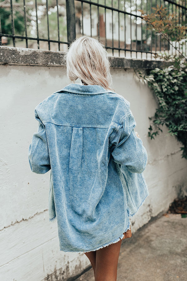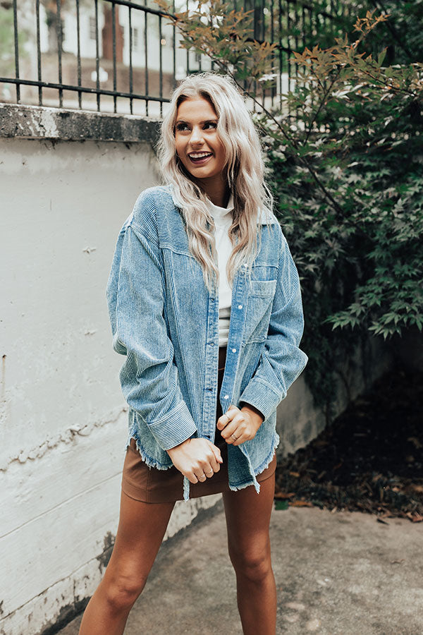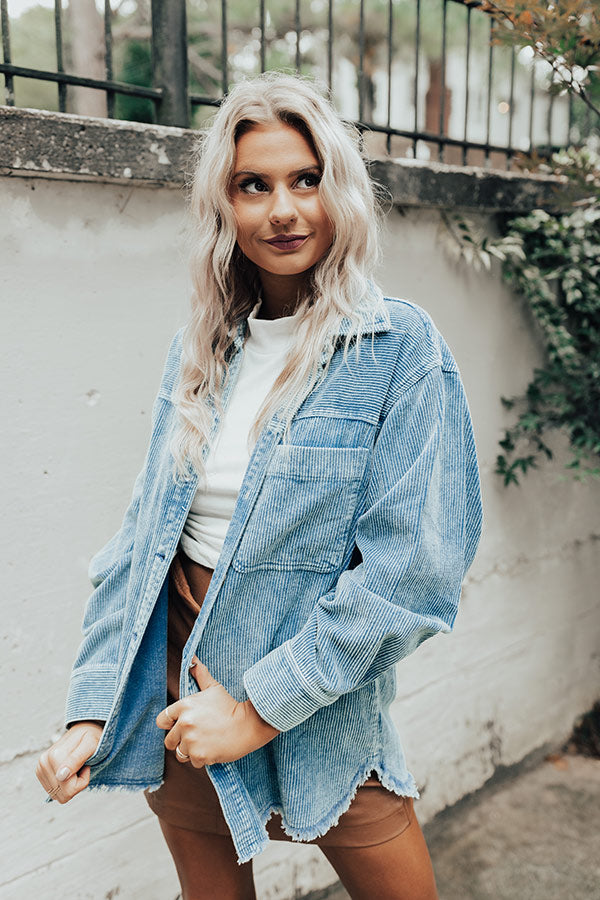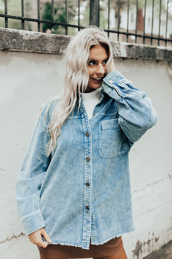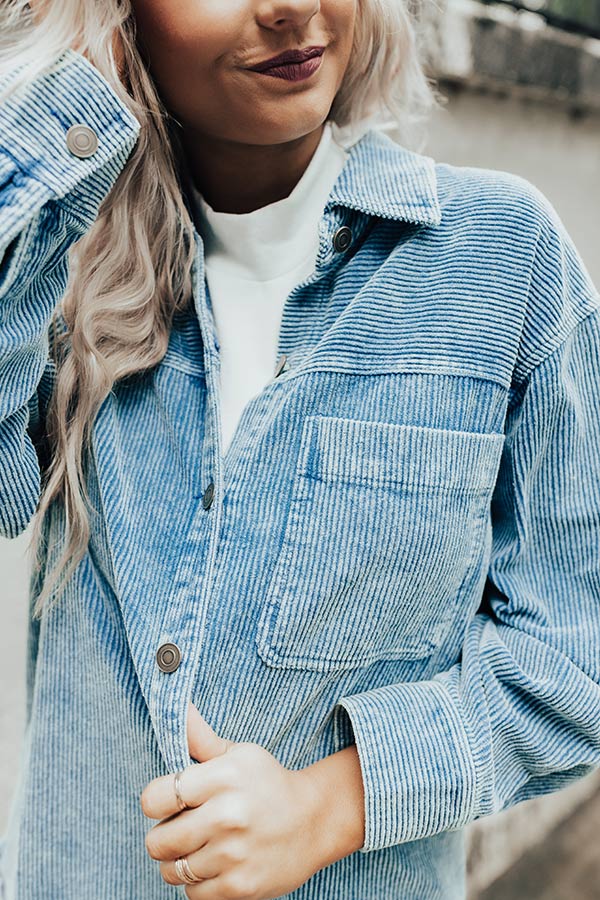 You are sure to look like a cutie in this trendy blue top featuring corduroy material, a button up front with a collared neckline, long loose sleeves with button closure cuffs, a single accent chest pocket, and a relaxed silhouette that falls into a rounded raw-cut hemline! This piece is perfect for layering over your fave basic or for wearing solo buttoned up! Measurements