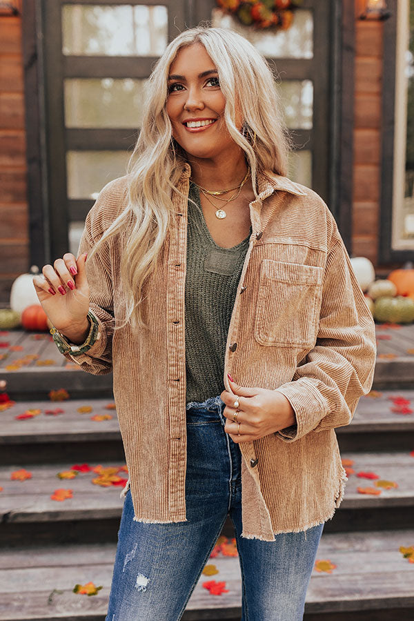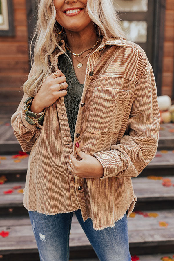 You are sure to look like a cutie in this trendy khaki colored top featuring corduroy material, a button up front with a collared neckline, long loose sleeves with button closure cuffs, a single accent chest pocket, and a relaxed silhouette that falls into a rounded raw-cut hemline! This piece is perfect for layering over your fave basic or for wearing solo buttoned up! Measurements