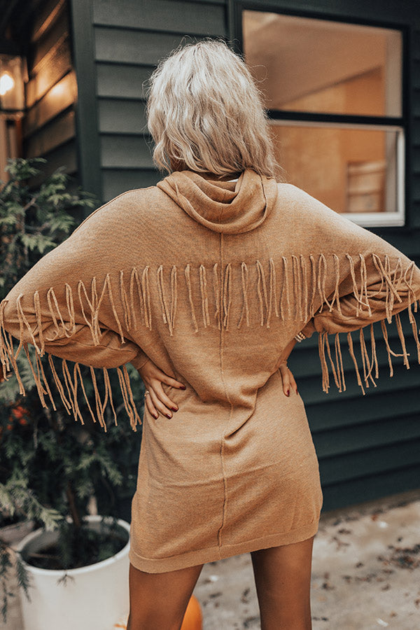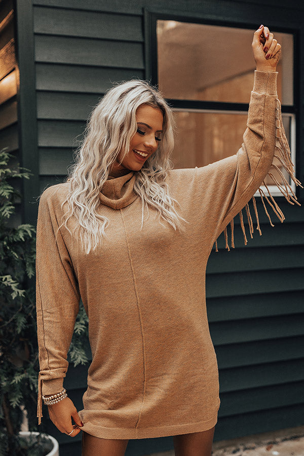Arrive in style with our adorable camel colored 'Corn Maze Sweater Dress' featuring soft tight knit material, a bunched turtle neckline, long loose sleeves with fringe detailing down the sleeves and across the back, and a relaxed but flattering silhouette that falls into a straight mid-thigh length hemline!
