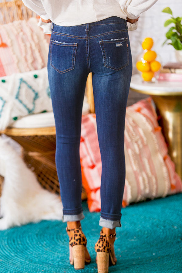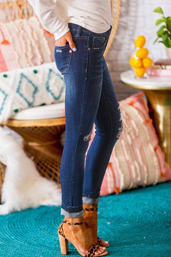 These dark wash distressed skinny jeans have a mid-rise fit, great stretchy fitted feel, distressed knees & pockets & a skinny pant leg with a raw ankle-length hem.