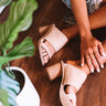 Step out in style with our "Cosmic" sandal! Crafted from smooth leather, it features a stacked-look, rounded 3-inch heel with a slip-on silhouette and two supportive straps at the ankle and toe!