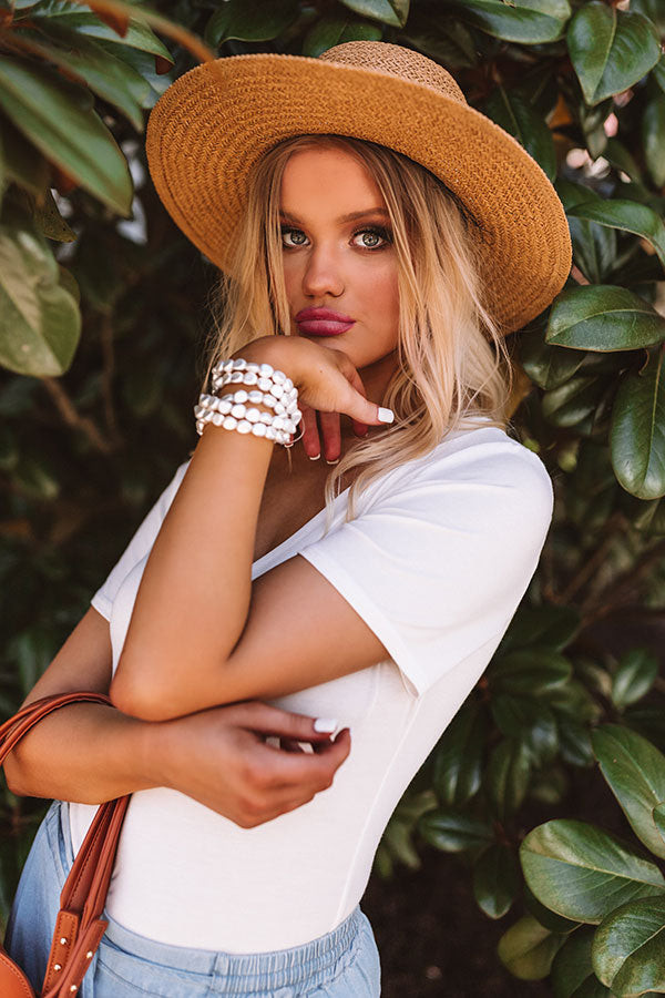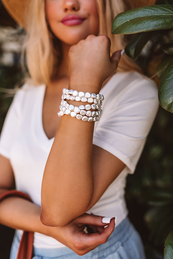 Add some extra glitz to your OOTD with our adorable "Costa Kisses Bracelet Set" featuring five pieced adorned with metallic ivory colored oblong beads!