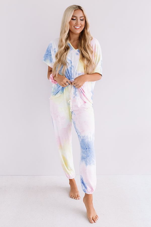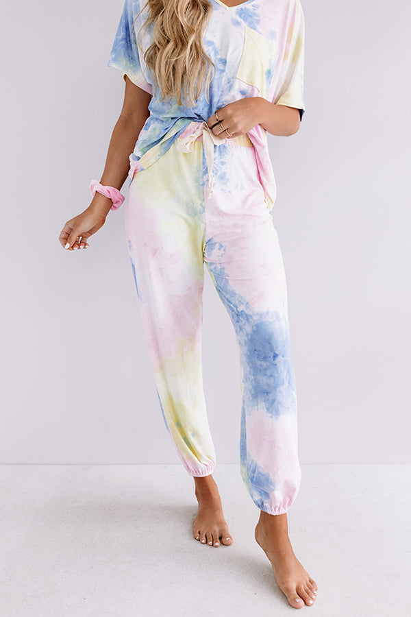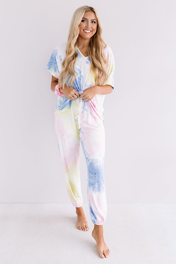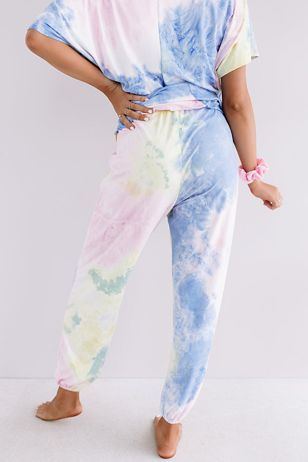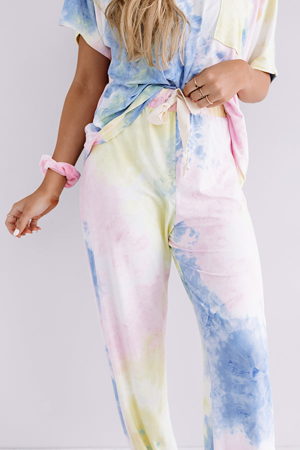 You can count on these adorable joggers being cozy with their ultra soft lightweight material patterned with blue, pink, and yellow hued tie dye, a wide elastic waistline with a tie belt, and a relaxed pants silhouette that falls into fitted ankle length hemlines! This comfy piece styles perfectly with our matching "Count On Cozy Tie Dye Tee," a scrunchie, and some fuzzy slippers for the ultimate two-piece lounge look!