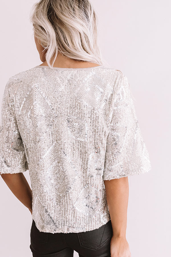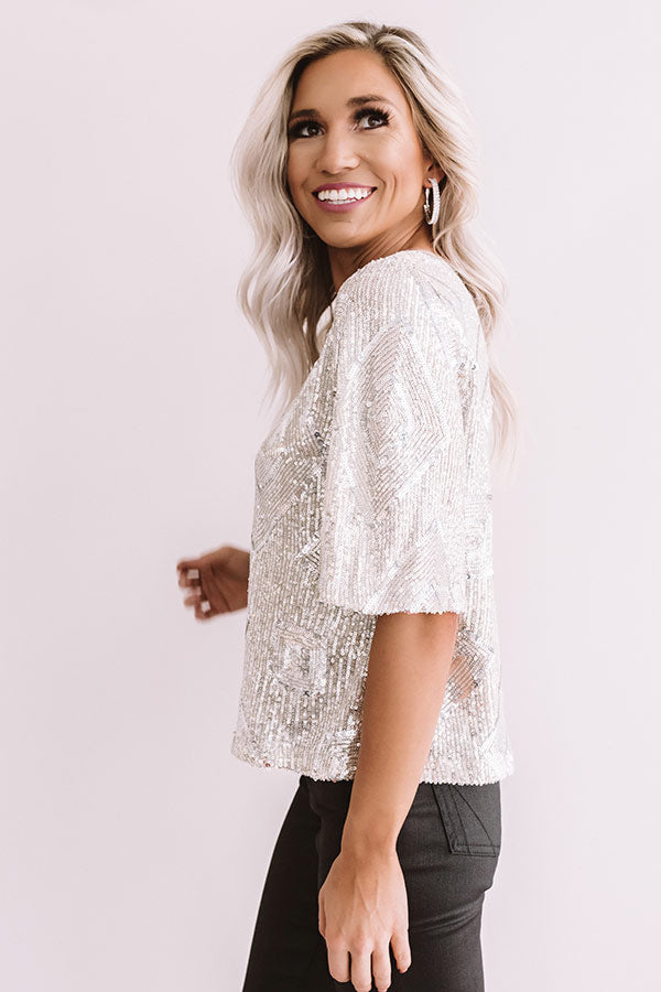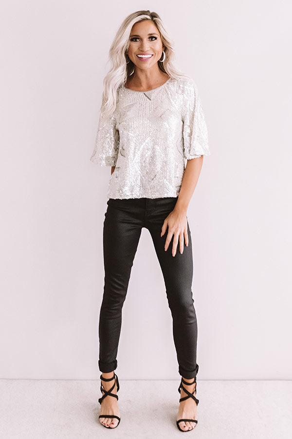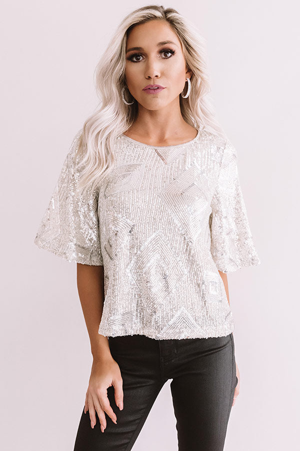 Add a little sparkle to your fall wardrobe with our ivory colored "Countdown To Champagne" top featuring lightweight sequin covered material with diamond patterns and subtle ribbed texturing, a high rounded neckline, loose half sleeves, and a relaxed silhouette that falls into a straight hemline! This glitzy stunner can be styled a variety of different ways, like with some black faux leather skinnies and strappy heels, or you can dress it down by layering it under our "Pumpkin Spice Cuddly Cardigan in Grey" some distressed boyfriend jeans, "The Seraphina Faux Leather Wedge in Grey," and a wine colored faux suede hat and crossbody! Measurements