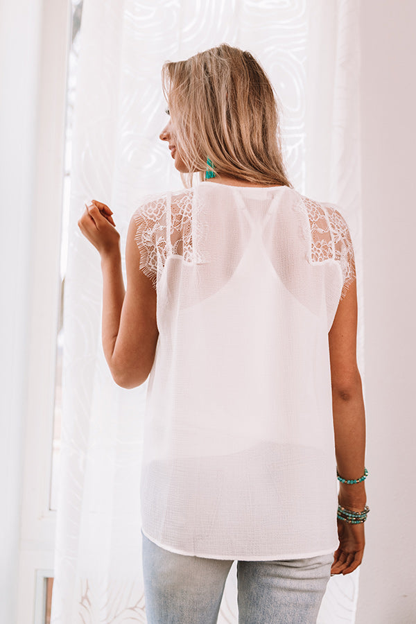 Keep it chic in our white "Countdown To Cocktails" top featuring lightweight breezy semi-sheer material layered over a sewn in tank top with adjustable spaghetti straps, intricate lace detailing on the deep v-cut neckline and short cap sleeves, and a relaxed silhouette that falls into a straight hemline! You can wear this piece a variety of ways, like solo with some distressed ankle skinnies and neutral wedges, but you can also layer it under our "Poolside Kisses Knit Cardigan in Blooming Dahlia" with some frayed jean shorts, "The Lila Woven Flat in White," and our "Right On Cue Fringe Crossbody in White!" Measurements
