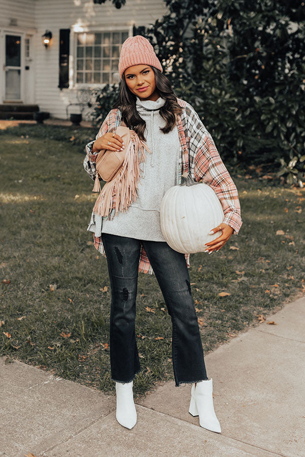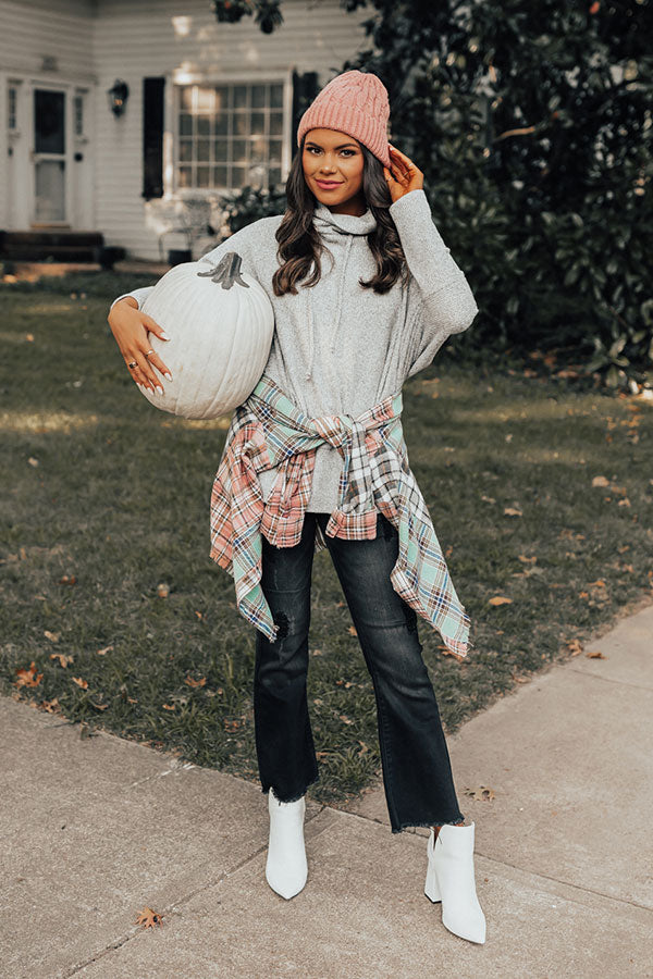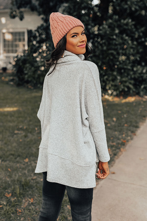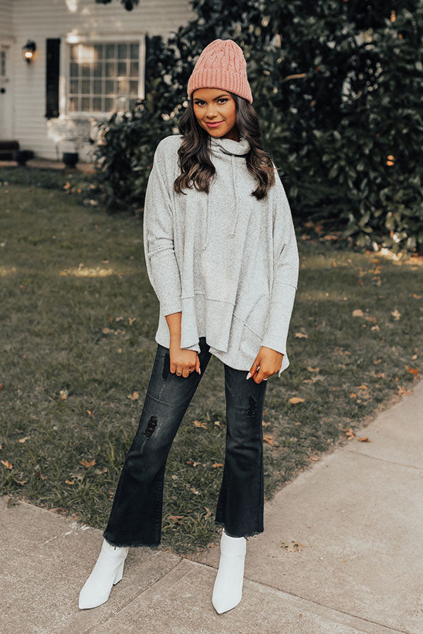 Stay casual but cute in our versatile grey 'Counting Kisses' sweater featuring soft lightweight material with waffle knit texturing, a bunched turtle neckline with a drawstring closure, long PIKO sleeves with fitted forearm cuffs, and a relaxed silhouette that falls into a straight hemline!