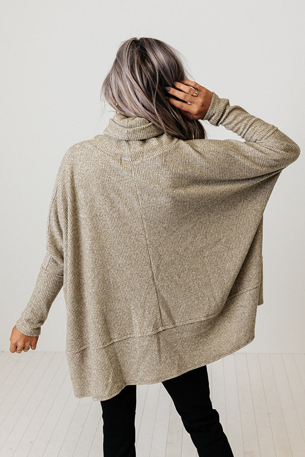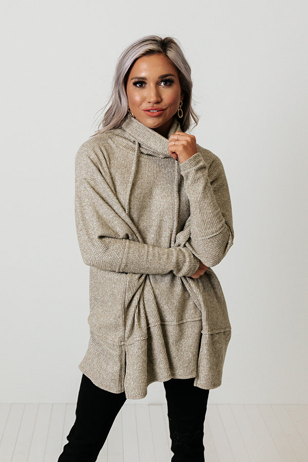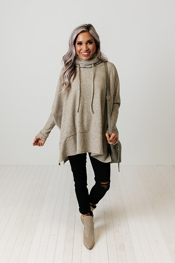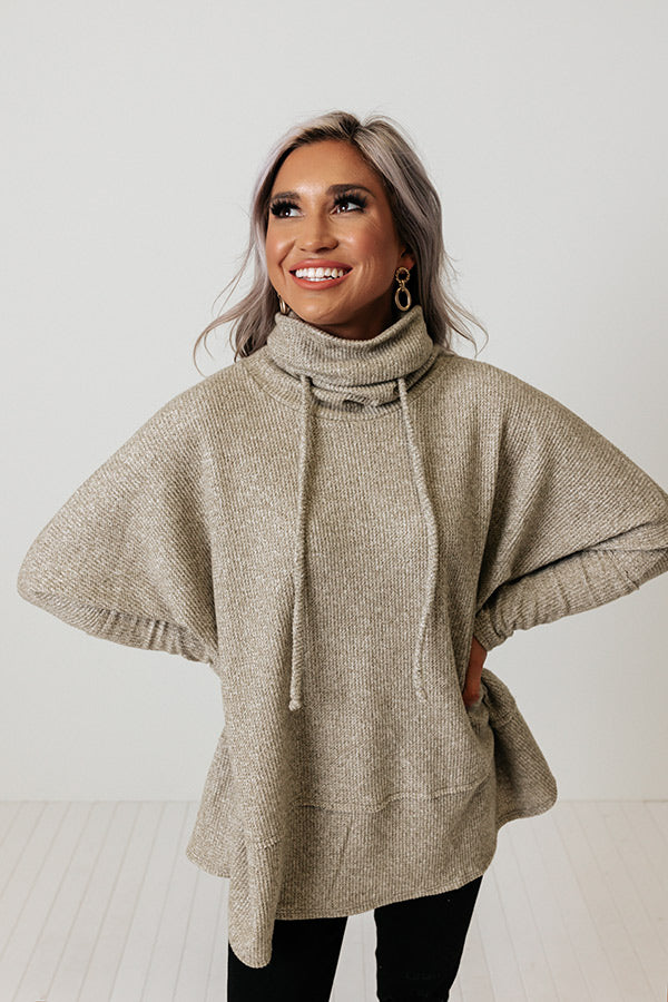 Stay casual but cute in our versatile light sage colored 'Counting Kisses' sweater featuring soft lightweight material with waffle knit texturing, a bunched turtle neckline with a drawstring closure, long PIKO sleeves with fitted forearm cuffs, and a relaxed silhouette that falls into a straight hemline! Measurements