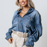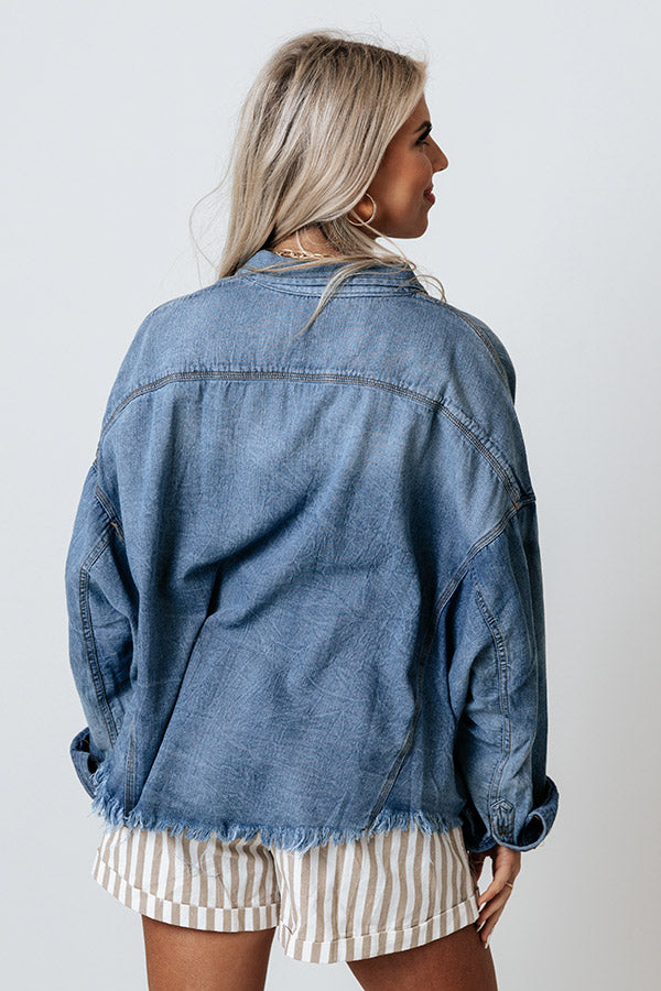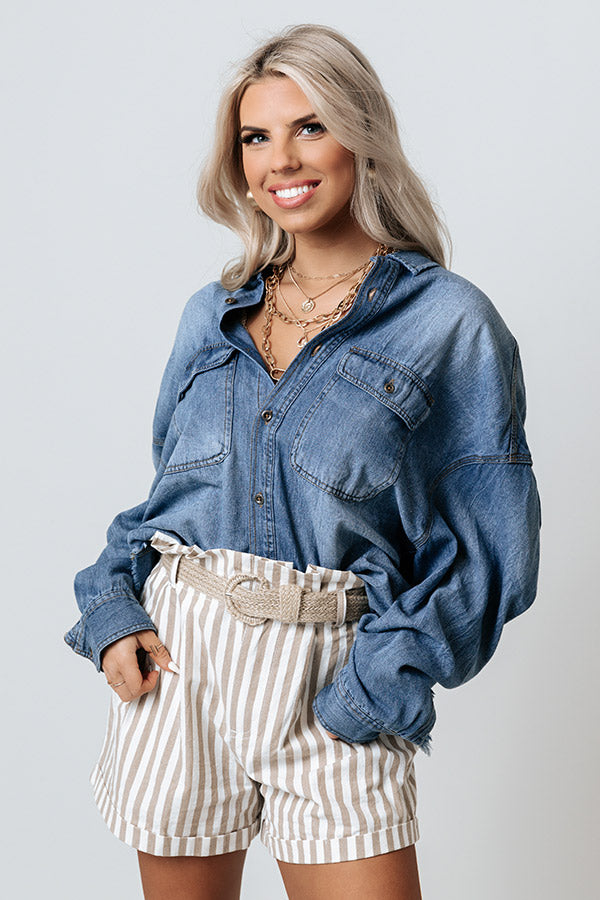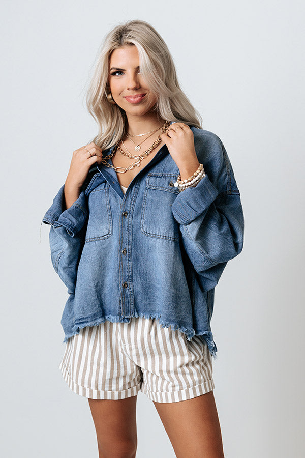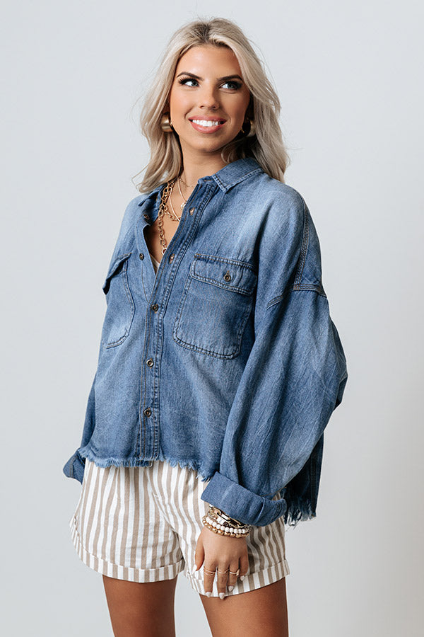 Add a touch of country charm to your spring wardrobe with this adorable top featuring lightweight medium wash chambray material with subtle accent fading, a button down front with a collared neckline, two accent chest pockets with flap closure, long loose sleeves with button closure cuffs, and a relaxed silhouette that falls into an uneven hemline with frayed trim detailing!