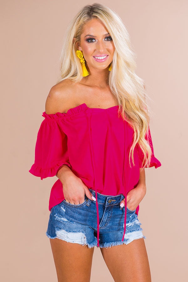 Enjoy brunch on the patio with your besties in the "Country Club Off Shoulder Top!" This hot pink babe has a ruffled elasticized neckline with decorative drawstrings, flirty ruffled sleeves & a relaxed poly bodice. Style with your favorite denim & a colorful statement earring for a chic look that is perfect for all of your sunny day adventures!