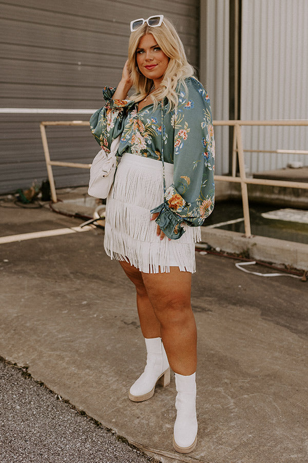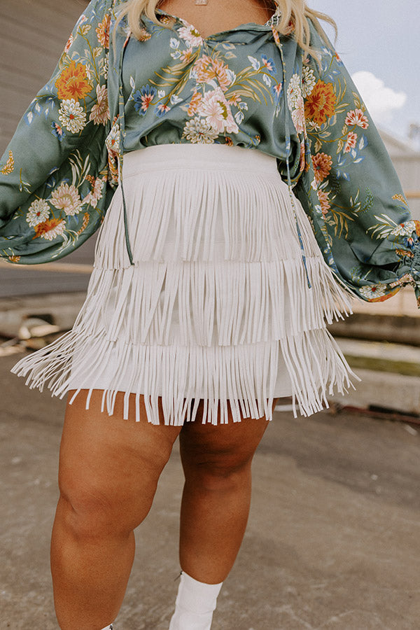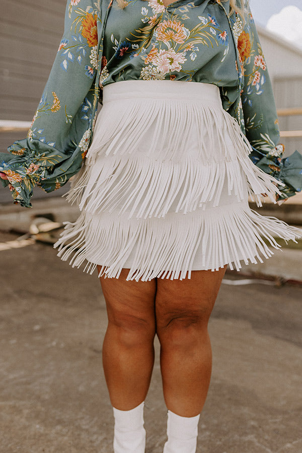 The perfect piece for twirling, our trendy white plus size 'Country Road' skirt featuring faux leather material with eye-catching fringe detailing, a high waistline, a side zip closure, and a flattering silhouette that ends in a straight mid-thigh length hemline!