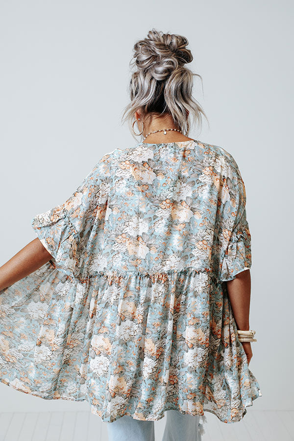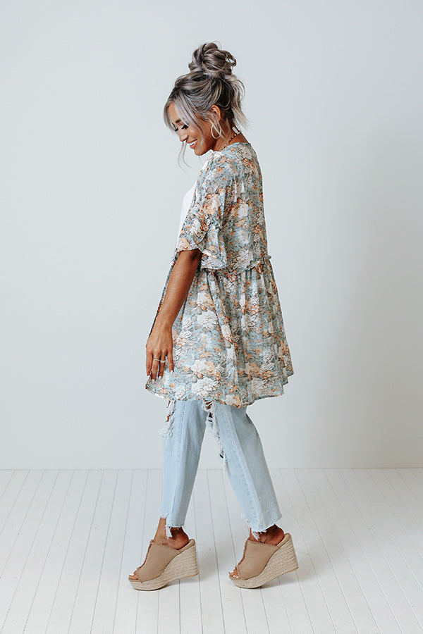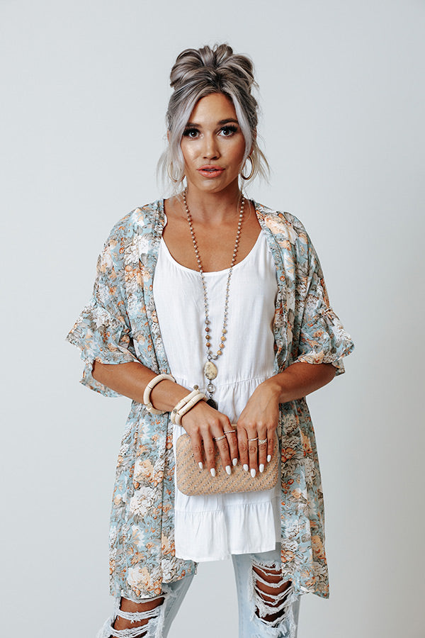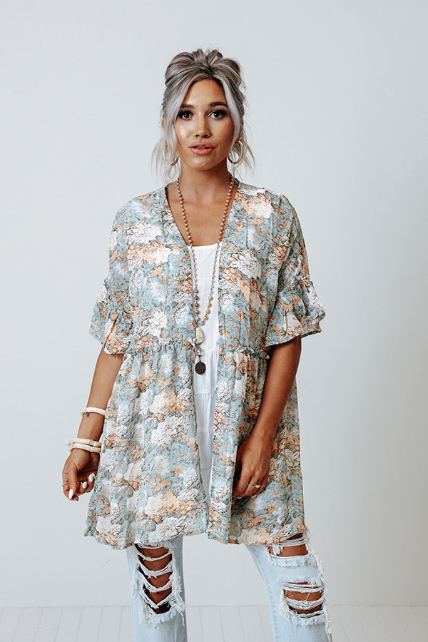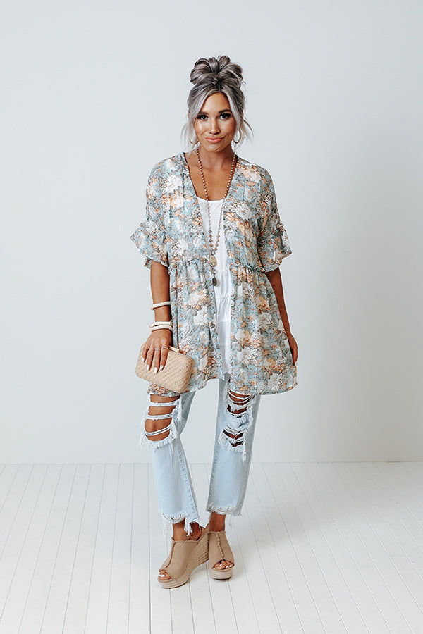 Layer up in style with our adorable 'Cover Me In Florals Overlay' featuring ultra lightweight breezy material patterned with an abstract airy blue, cream, and natural hued print, short loose sleeves with ruffled trim cuffs, a cinched accent seam at the waist, and a draped open front silhouette that falls into a straight upper-thigh length hemline! Measurements