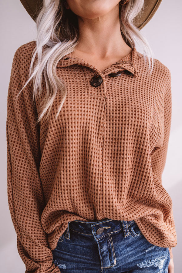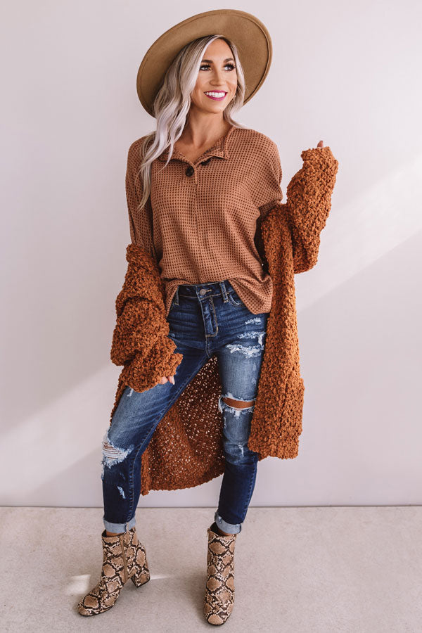 This adorable cinnamon colored transitional top is "cover story" worthy with its soft lightweight material, waffle knit texturing, tortoiseshell button up bodice with a v-cut neckline, long loose sleeve with fitted cuffs, and a relaxed silhouette that falls into a rounded hemline! We have styled this cutie with some distressed ankle skinnies, snake print booties, and a neutral faux suede hat, but you can also layer it under our "Fallin' For Autumn Fringe Vest in Taupe" with some black flares, "The Seraphina Faux Leather Wedge in Taupe," and "The Real Deal Faux Leather Tote in Cinnamon!" Measurements