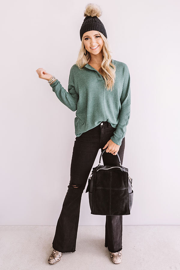 This adorable hunter green transitional top is "cover story" worthy with its soft lightweight material, waffle knit texturing, tortoiseshell button up bodice with a v-cut neckline, long loose sleeve with fitted cuffs, and a relaxed silhouette that falls into a rounded hemline! We have styled this cutie with some distressed flares, snake print booties, and a black backpack and beanie, but you can also layer it under our "Fallin' For Autumn Fringe Vest in Taupe" with some light wash skinnies and "The Seraphina Faux Leather Wedge in Taupe!" Measurements