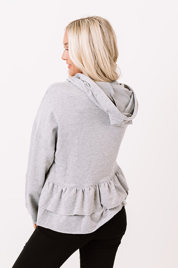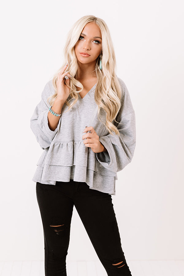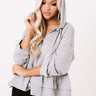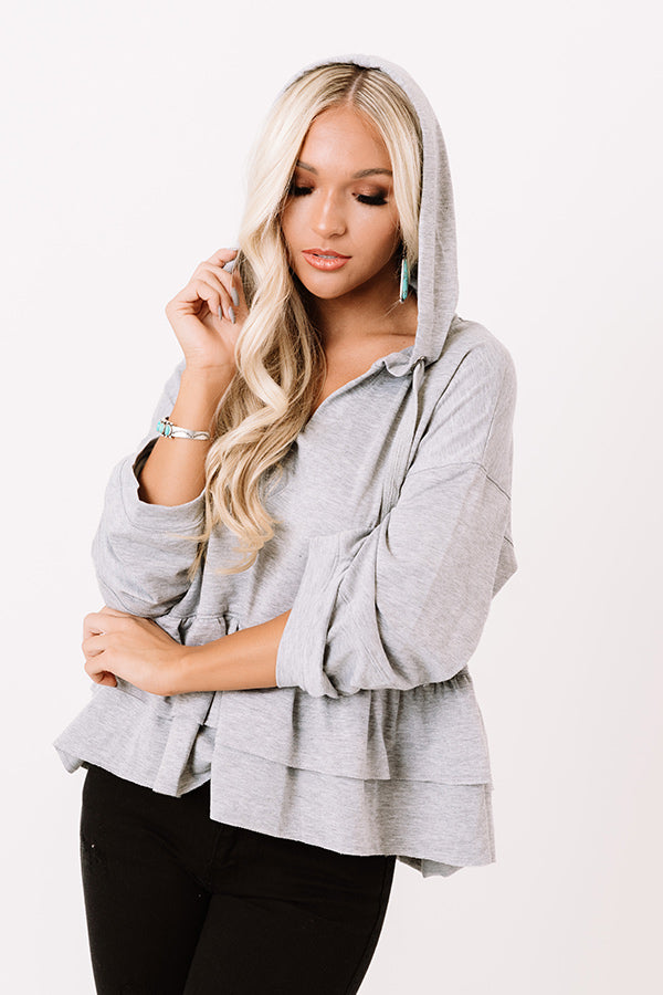 Everything is cozier at the cabin, especially when you slip on this cute grey sweater featuring soft lightweight material, a v-cut neckline with a drawstring hooded back, long oversized sleeves, and a draped silhouette that falls into a tiered peplum bottom with an uneven hemline!