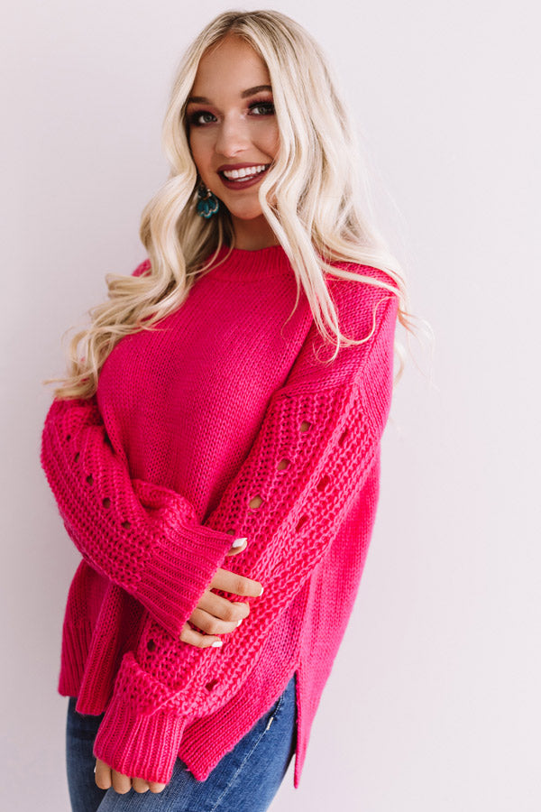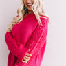 Not everything will be "cozier in Canada" when you wear this warm hot pink sweater featuring a loose knit material, long loose textured sleeves with eyelet detailing and fitted cuffs, a high rounded neckline, and an ultra relaxed silhouette that falls into straight ribbed hemline with side slits! This piece can be styled with anything from distressed ankle skinnies, statement turquoise earrings, and a neutral bootie and tote, or with some black flares and patterned accessories like "The Cassandra Leopard Bootie" and our "Own The Spotlight Leopard Hat!" Measurements