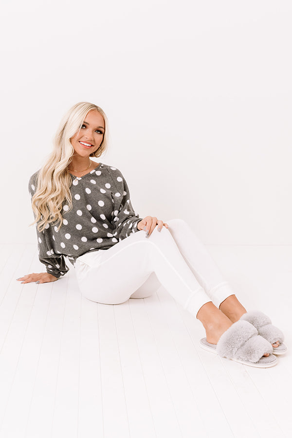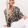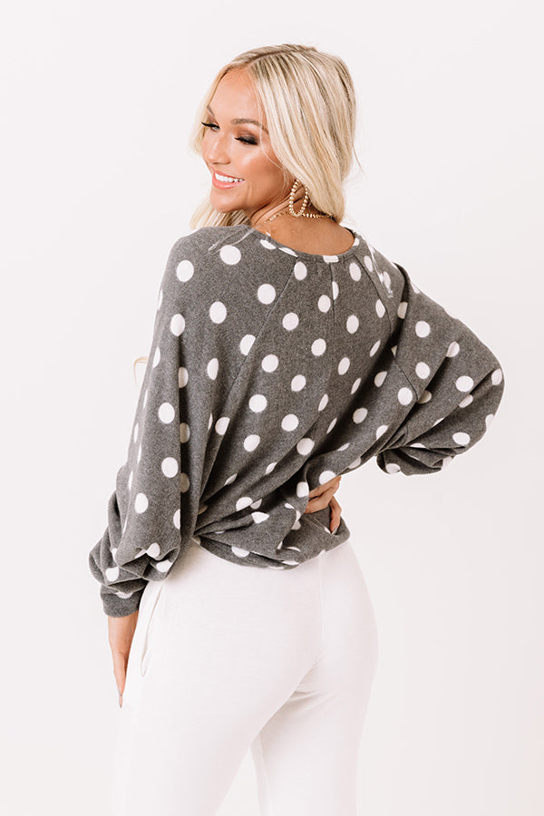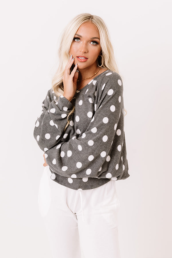 This adorable grey shift top is the coziest ever with its soft lightweight material, large white polka dot pattern, a high rounded neckline, long loose sleeves with fitted cuffs, and an ultra slouched silhouette silhouette that ends in a rounded hemline!