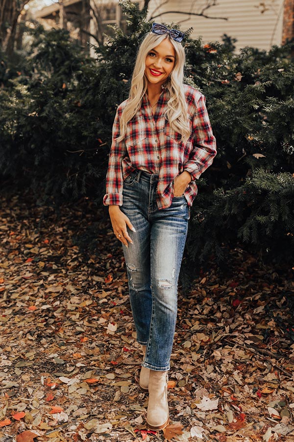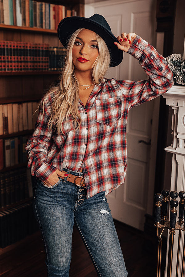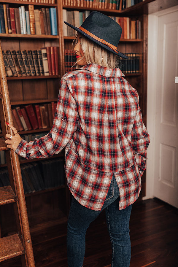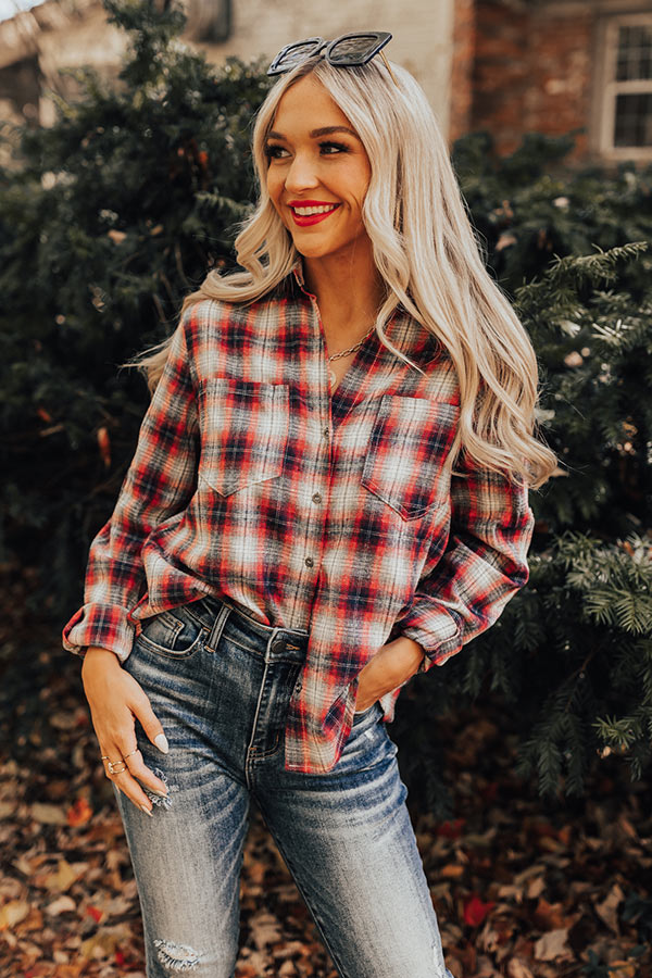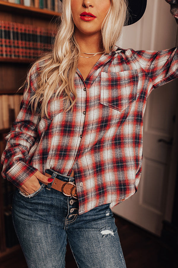 Keep it cozy in this seasonal top featuring soft material patterned with a red and black plaid print, a button down front with a collared neckline, long loose sleeves with button closure cuffs, two chest pockets, and a relaxed silhouette that falls into a rounded hemline with a center back accent slit!
