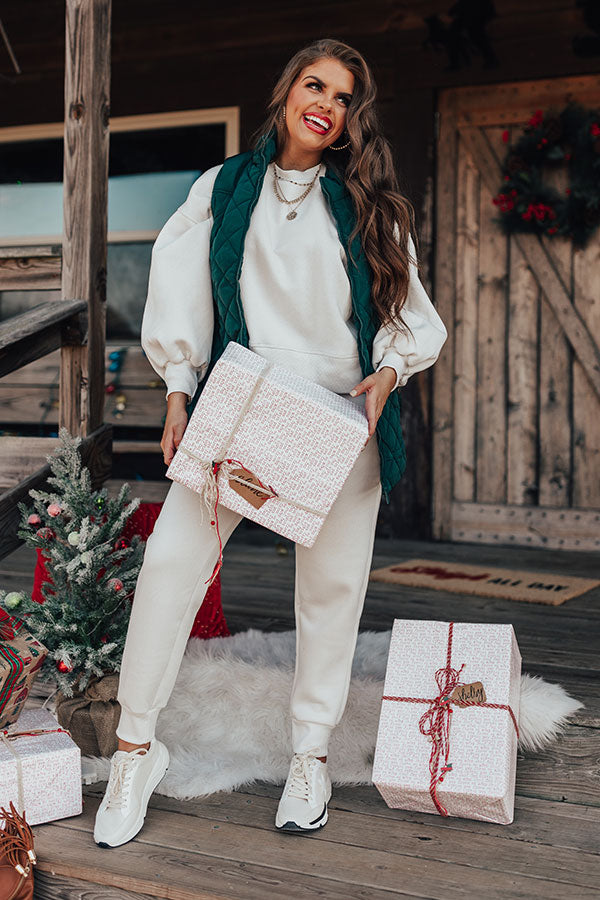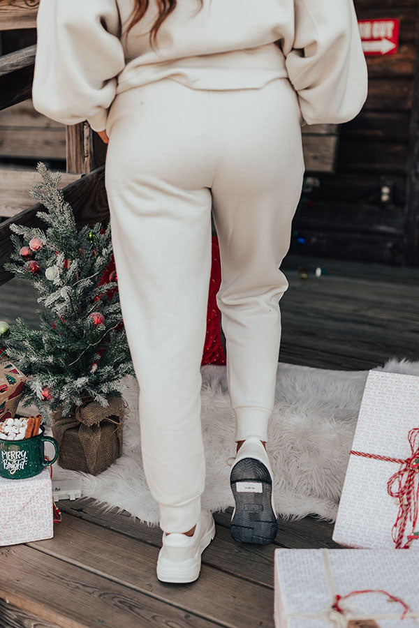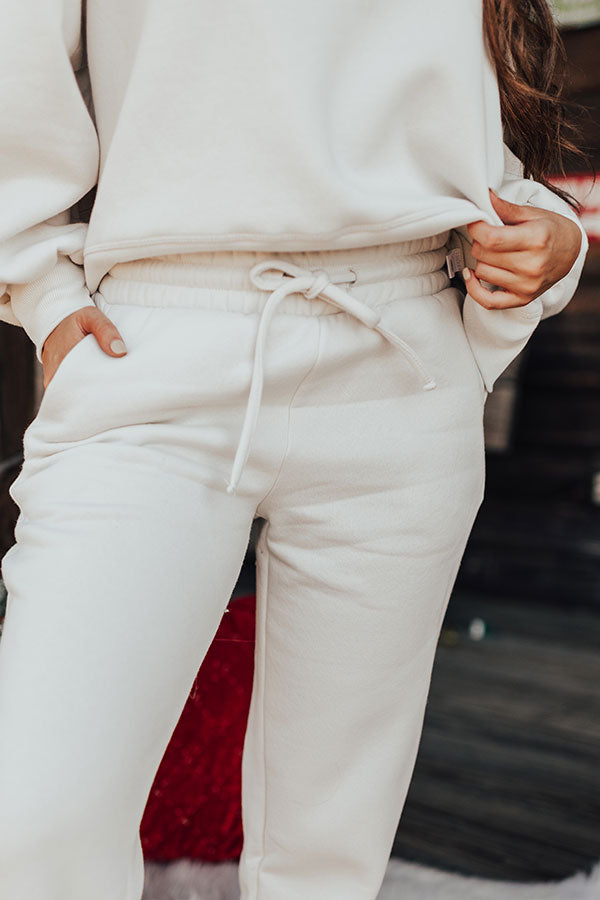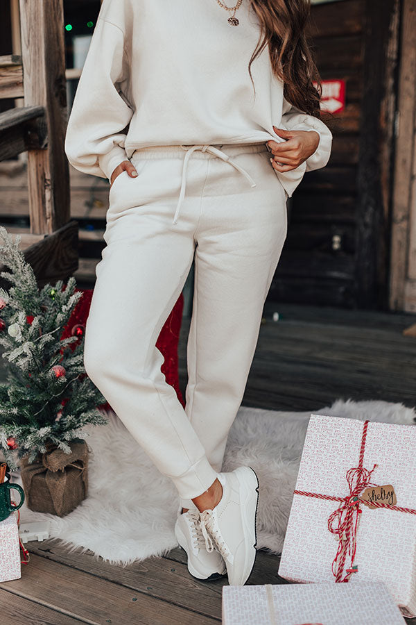 Add to your cozy aesthetic with these casual cute ivory colored joggers featuring ultra soft lightweight but warm material, a wide smocked waistline with a tie closure, accent side pockets, and a slouched pants silhouette that tapers into fitted ankle-length hemlines! Measurements