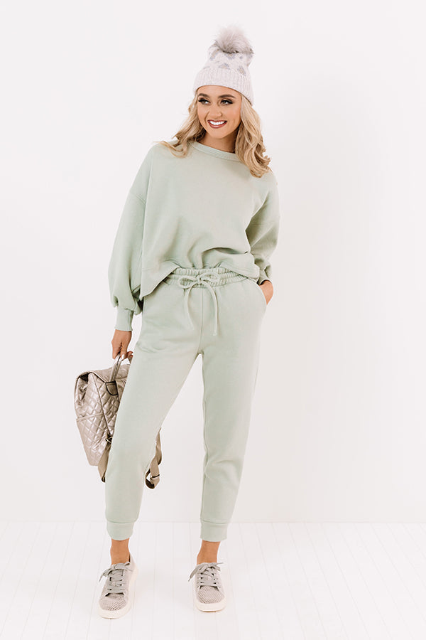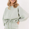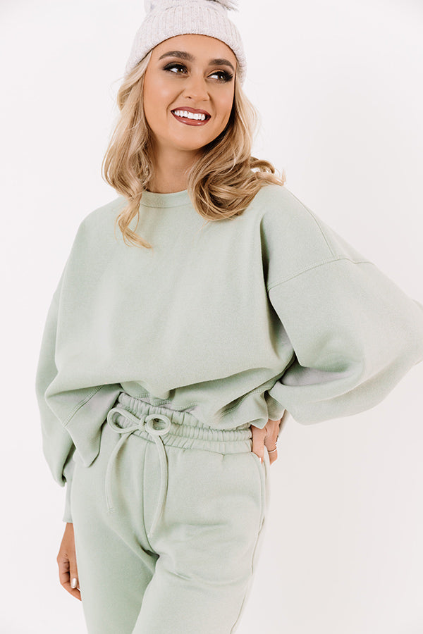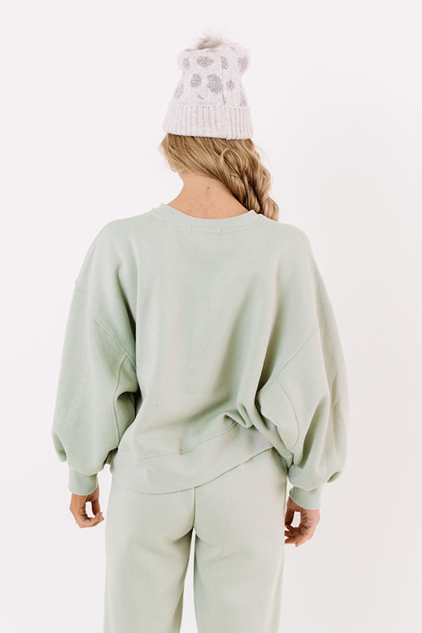 Add to your cozy aesthetic with this casual cute light sage colored sweatshirt featuring soft lightweight but warm material, a high rounded neckline, long loose sleeves with fitted cuffs, and a slouched silhouette that ends in a straight hemline! Measurements