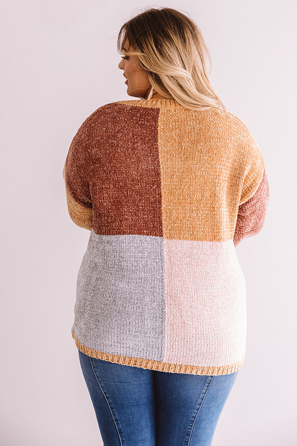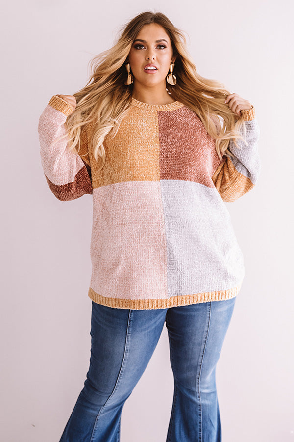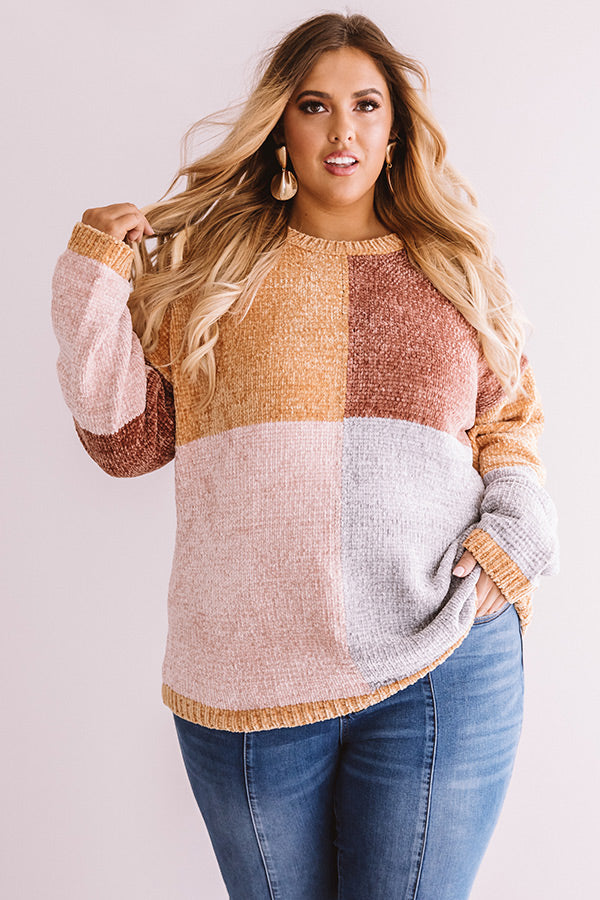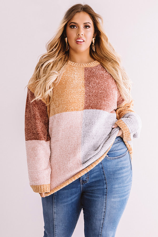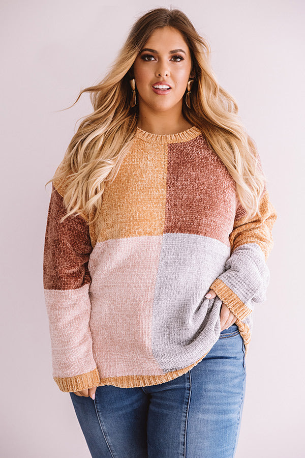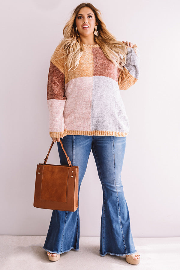 Plus Size - You will undoubtedly feel "cozy and carefree" in this adorable sweater featuring soft lightweight tight knit chenille material with ribbed texturing, a high rounded neckline, fall hued color block paneling, long loose sleeves, and a relaxed silhouette that falls into a straight hemline! We have styled this flirty and feminine cold weather essential with some denim flares and a neutral platform heel, and cinnamon colored tote, but you can also wear it with some distressed charcoal skinnies, "The Pryor Faux Leather Peep Toe Bootie in Blush," and our "Say It Ain's Soho Hat in Rust!" Measurements
