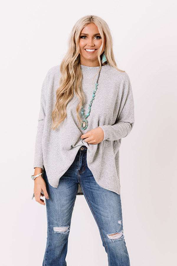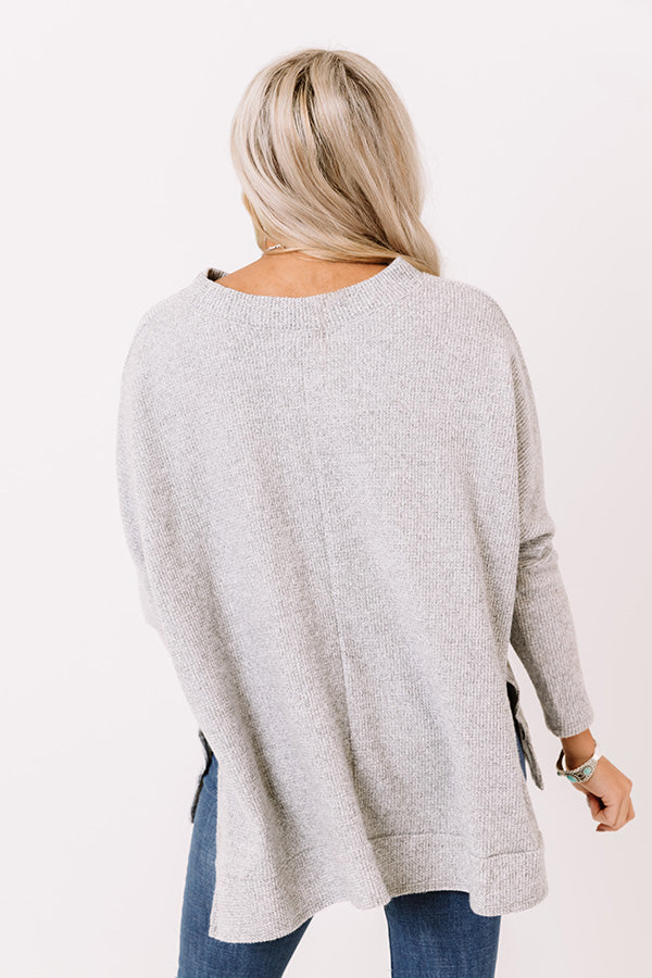 Get cozy by the tree in this grey casual cute top featuring warm and soft lightweight material, a button up bodice with a rounded neckline, long loose sleeves, and a relaxed silhouette that ends in a straight hemline with accent side slits! Measurements