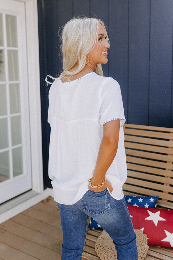 You are sure to be in a summer state of mind with our adorable white 'Cozy Cabana' top featuring lightweight breezy material patterned with a large navy floral embroidery, a high rounded neckline, short loose sleeves, stitched accent trim, and an ultra relaxed silhouette that falls into a straight tunic length hemline!