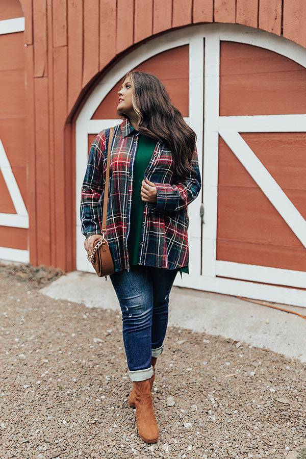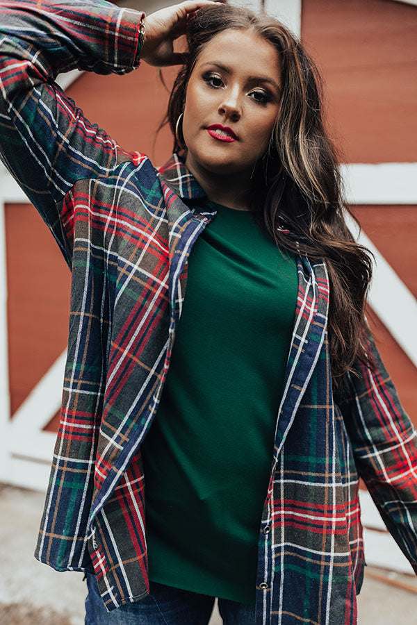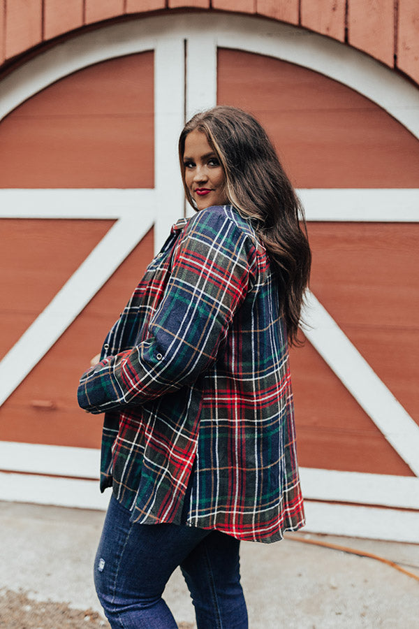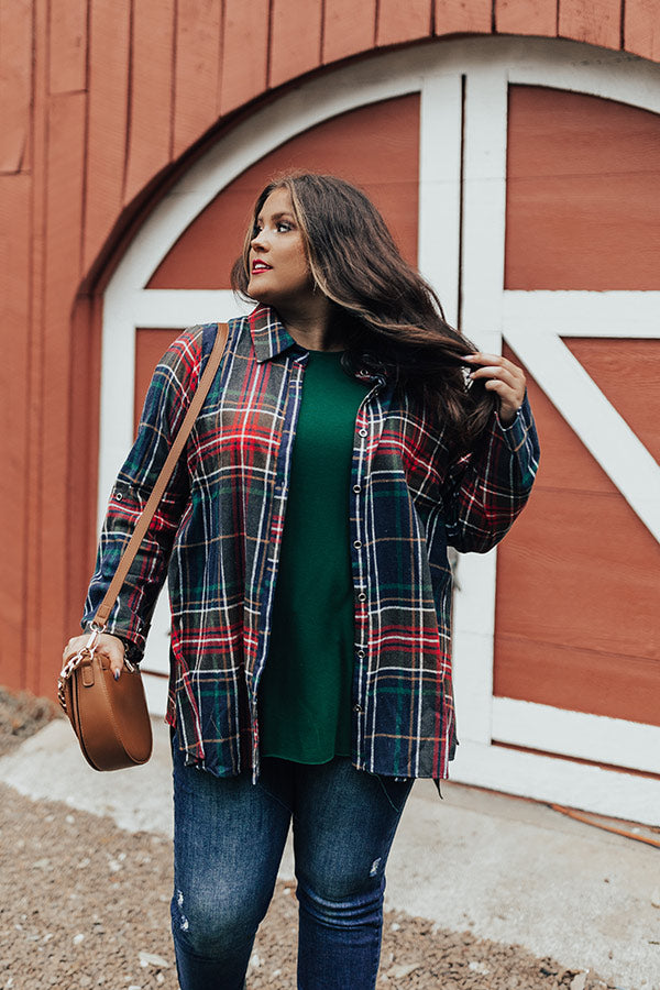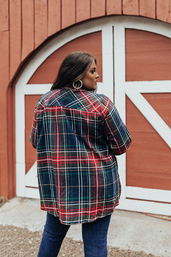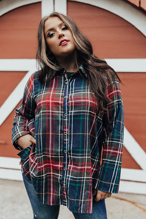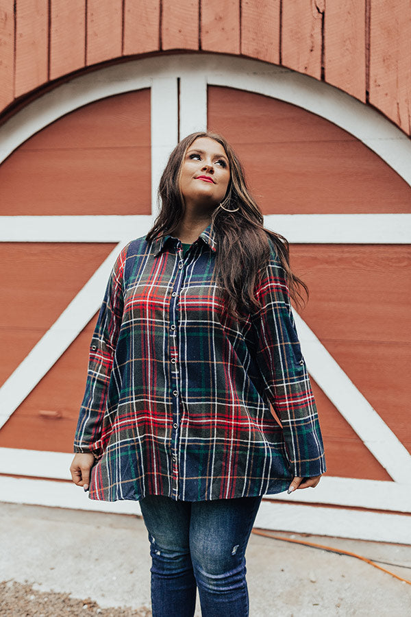 Upgrade your holiday wardrobe with our charming plus size navy 'Cozy Cabin Retreat Flannel' featuring lightweight but warm material patterned with red, green, yellow, and white plaid print, a button down front with a collared neckline, long loose sleeves with button closure cuffs, and a relaxed silhouette that falls into a rounded back hem and a straight front hemline! Measurements