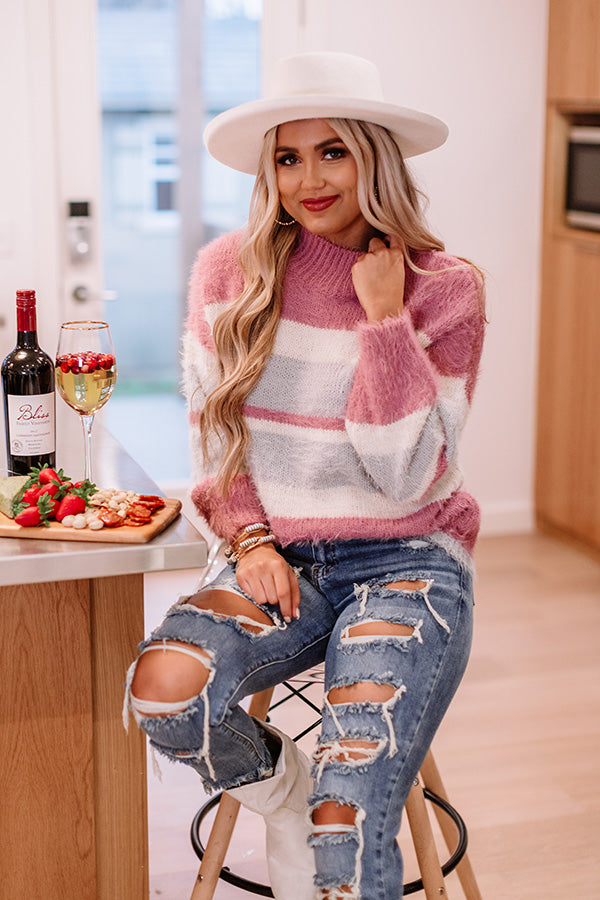 Get cozy in this sweet sweater featuring soft lightweight tight knit material patterned with horizontal violet, light grey, and white colored accent stripes, a high rounded neckline, fuzzy texturing, long loose sleeves with fitted cuffs that look adorable rolled, and a slouched silhouette that falls into a straight hemline!