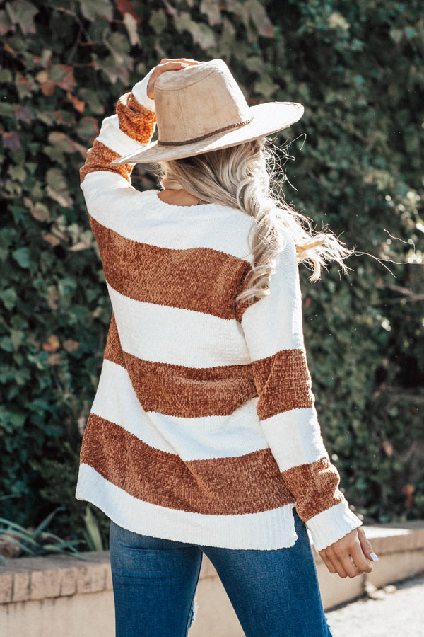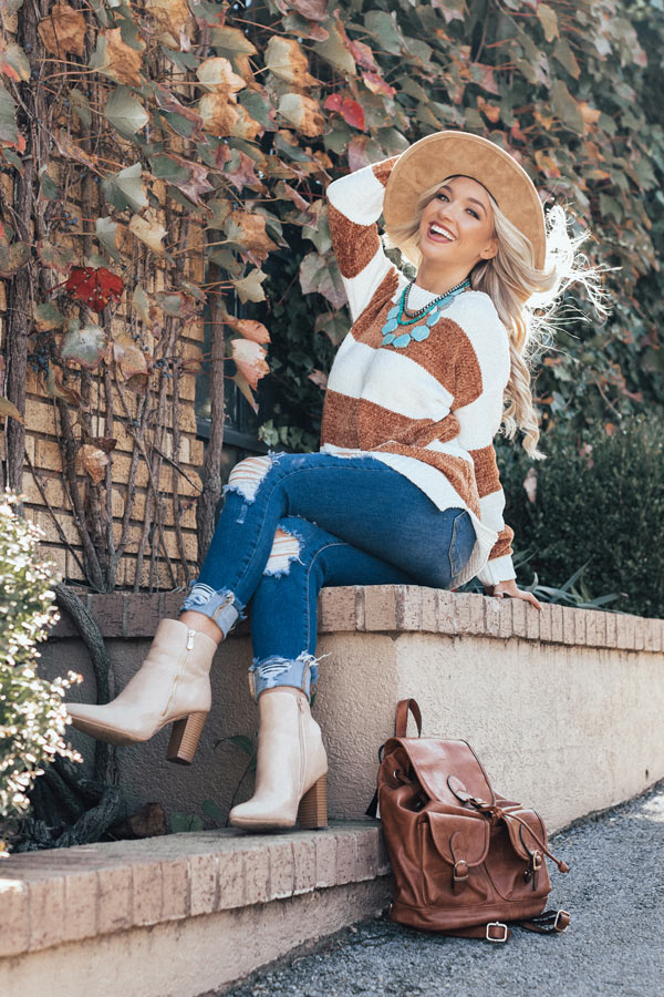 You won't find a more "cozy casual" piece to wear than this adorable sweater featuring soft lightweight tight knit chenille material with ribbed texturing, horizontal white and orange hued accent stripes, a high rounded neckline, long loose sleeves with more fitted cuffs, and a relaxed silhouette that falls into a straight hemline with v-notched side slits! This warm piece can be styled a variety of ways, like with some distressed ankle skinnies, turquoise statement jewelry, and a neutral bootie, backpack, and faux suede hat, or it can be worn with some charcoal flares and "The Seraphina Faux Leather Wedge in Grey!" Measurements