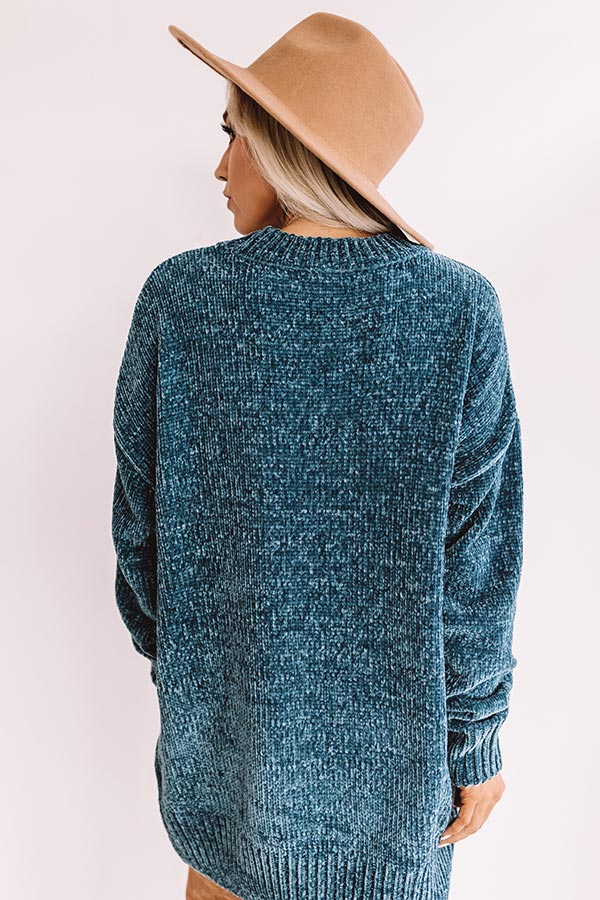Your fall style will be throwing a "cozy celebration" when you wear this teal colored sweater featuring an ultra soft chenille texture, a wide high rounded neckline, long loose sleeves with fitted cuffs, and a relaxed silhouette that falls into a straight tunic length ribbed hemline! This versatile piece can be styled with a statement necklace, and a neutral over the knee boot, clutch, and faux suede hat, or you can pair it with some white flares, "The Seraphina Faux Leather Wedge in Grey," and our "All Caught Up Headband in Grey!" Measurements