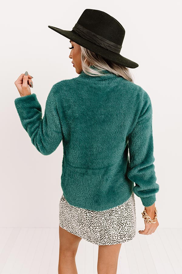 Our gorgeous hunter green hued 'Cozy Commute' sweater features lightweight ultra soft material with fuzzy texturing, subtle ribbed detailing, a bunched turtle neckline, long loose sleeves with fitted cuffs, and a flattering silhouette that ends in a straight hemline!