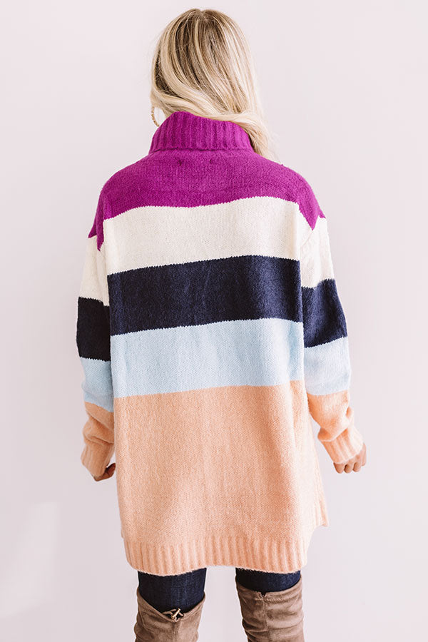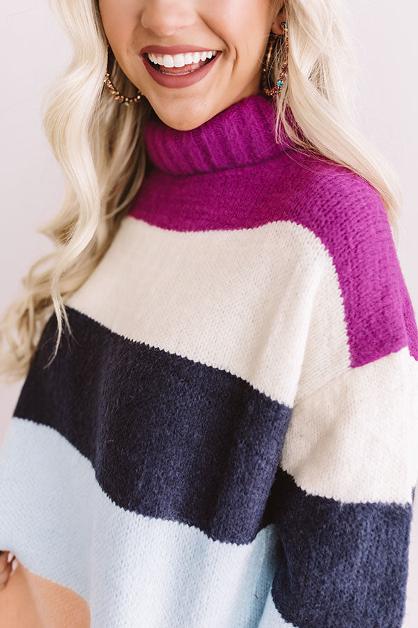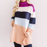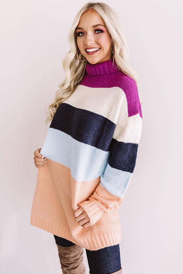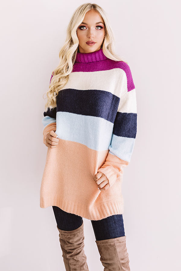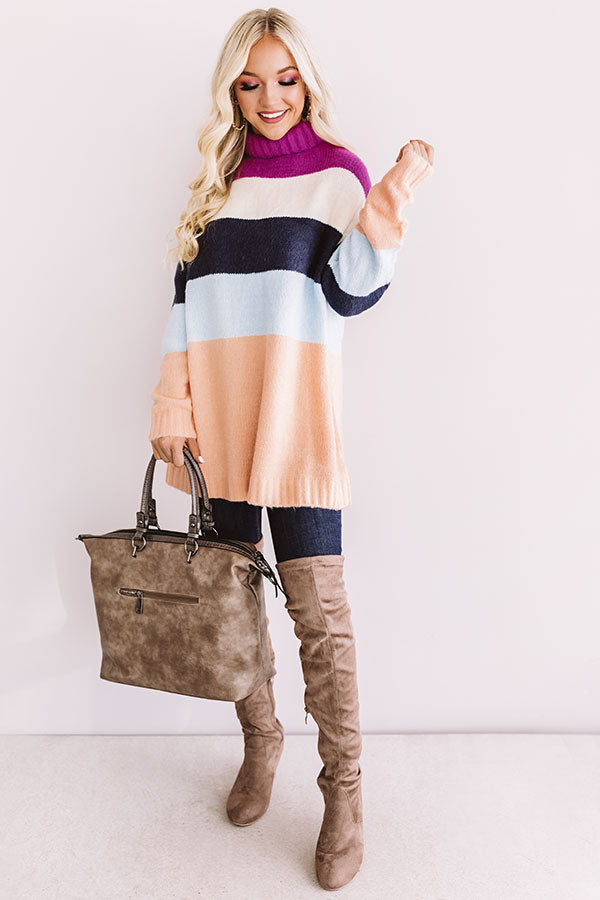 There is no better piece to wear on a "cozy date" than this tunic sweater featuring a stretchy loose knit material, horizontal color block stripes, a high turtle neckline, long loose sleeves with fitted cuffs, and an ultra relaxed silhouette that falls into a ribbed upper thigh length straight hemline! This adorable fall piece can be styled a variety of different ways, like with some dark skinnies, matching hoop earrings, and a neutral over the knee boot and tote, or you can swap the boots for our "Laws Of Attraction Velvet Heel in Wine" and add our "Sweet As Sugar Hat in Ivory!" Measurements