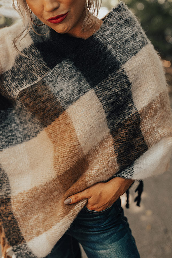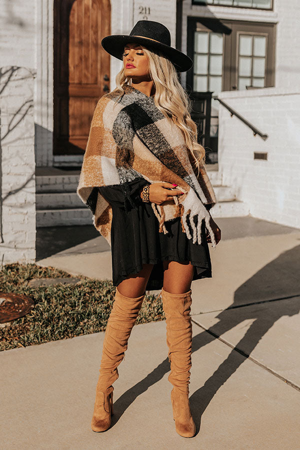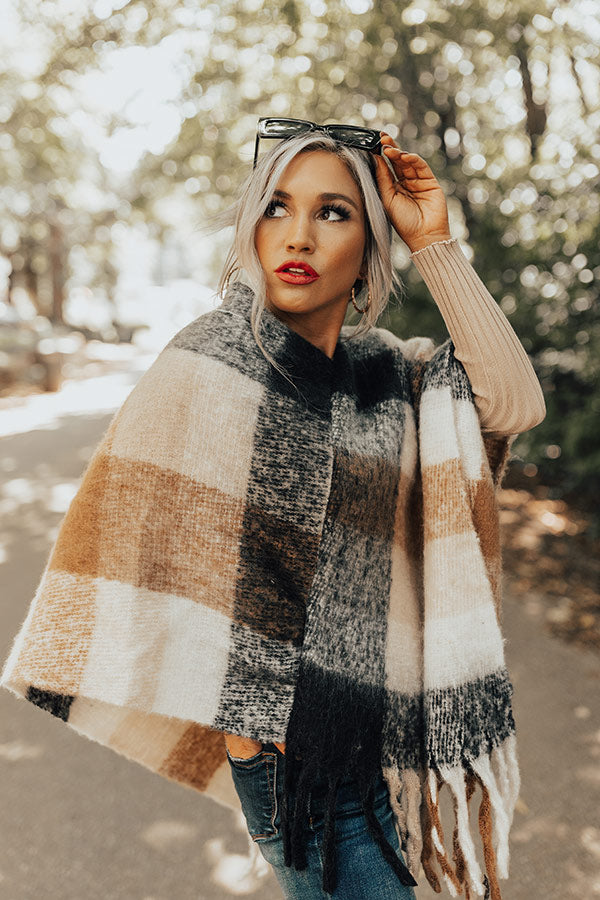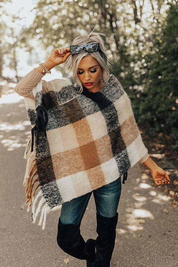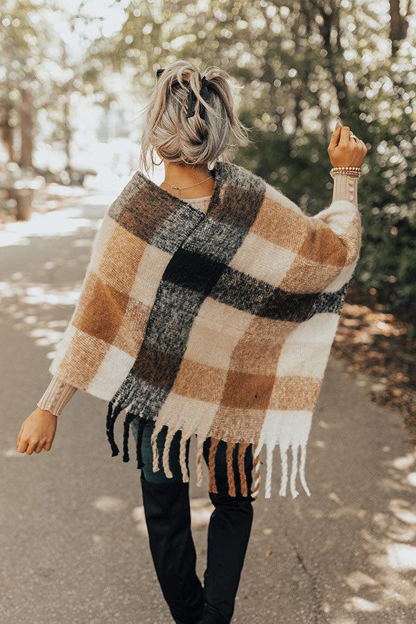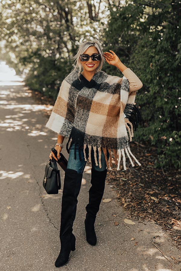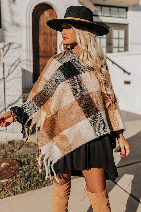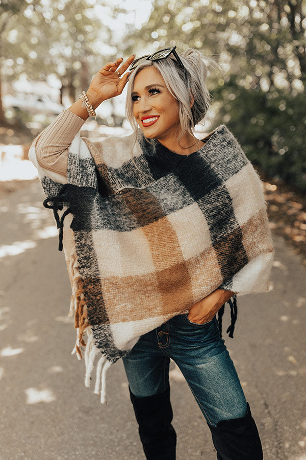 Make a cozy debut this fall with this chic camel colored poncho featuring ultra soft material patterned with a black and white plaid print, a high v-cut neckline, draped 3/4-length sleeves with open cuffs, and a relaxed silhouette that falls into a pointed mid-thigh length hemline with fringe trim detailing!