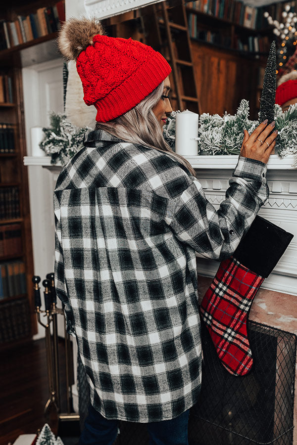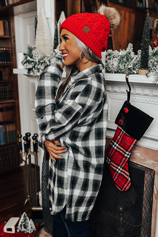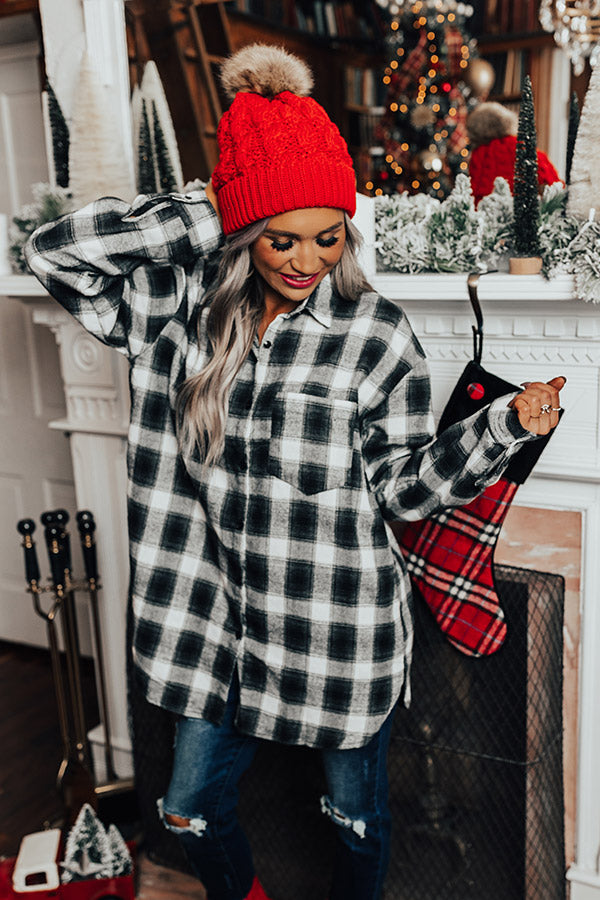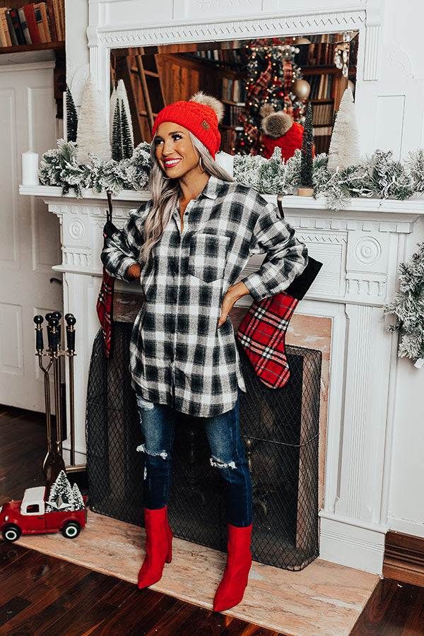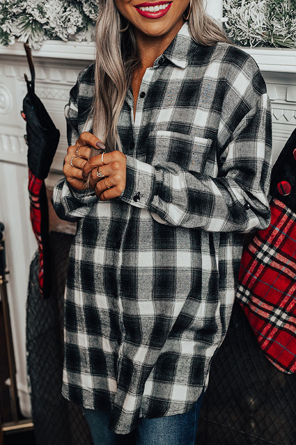 Our white 'Cozy Honey Flannel' is perfect for layering in the winter with its lightweight but warm material, black plaid print, a button down front with a collared neckline, long loose sleeves with roll-tab cuffs, and relaxed silhouette that falls into a straight tunic-length hemline! Measurements