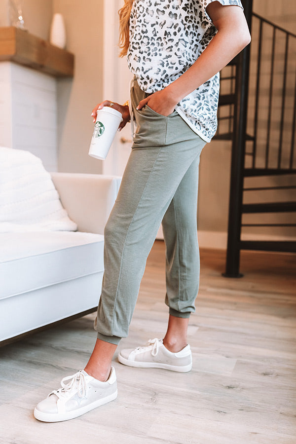 "Coziness is key" to having a relaxing morning or a good weekend spent lounging, and these olive colored joggers are the perfect piece to do that in! They feature soft lightweight tight knit material, an elastic waistline with a tie belt closure, accent side pockets, and a relaxed pants silhouette with fitted ankle length hemlines! We have styled these comfy cuties with a leopard top, accent headband, and trendy sneakers, but you can also wear them with a basic grey bodysuit under a cropped jean jacket, "The Calum Bootie in Grey," and "The Essential Faux Leather Backpack in Grey!" Measurements