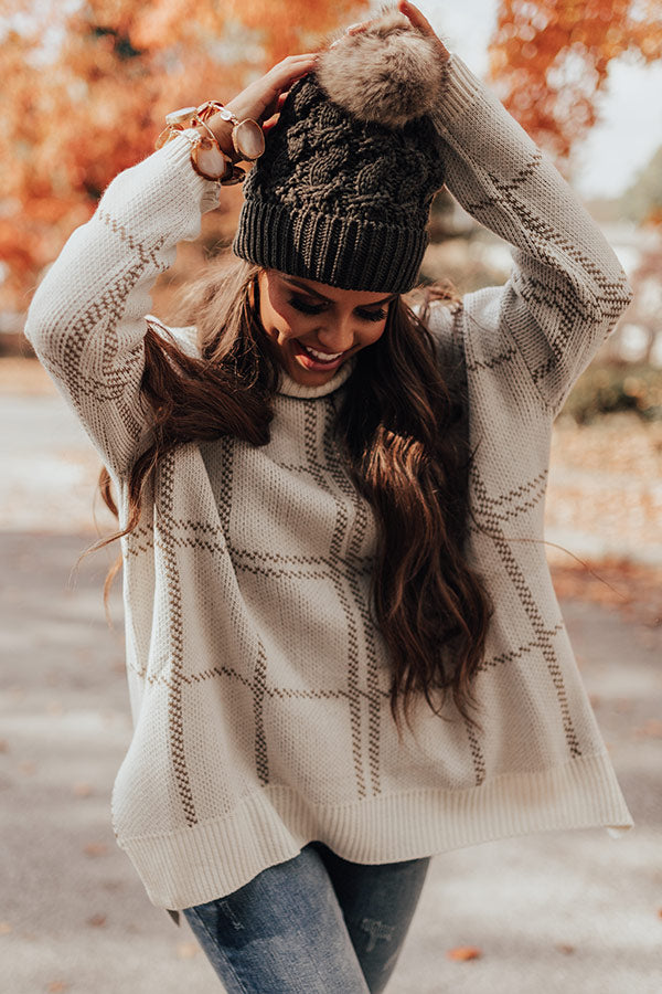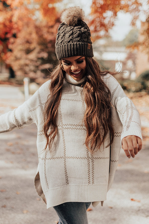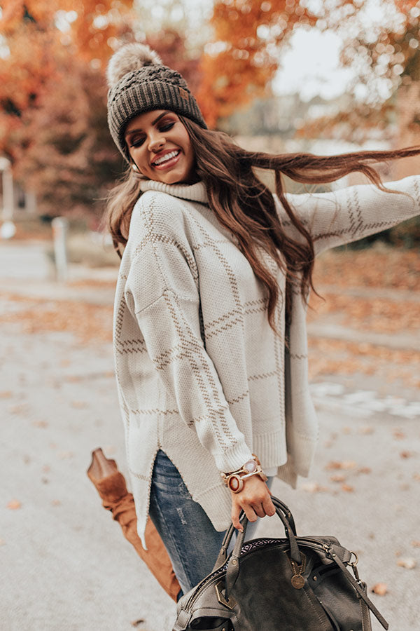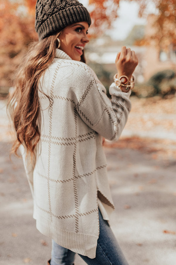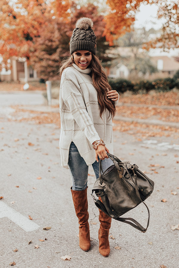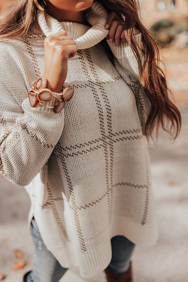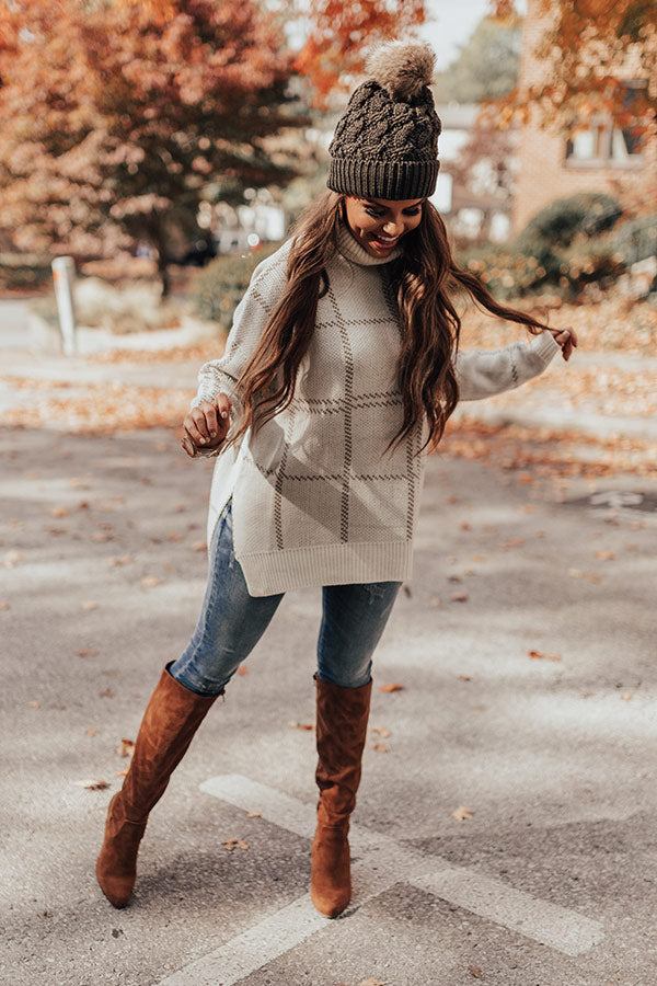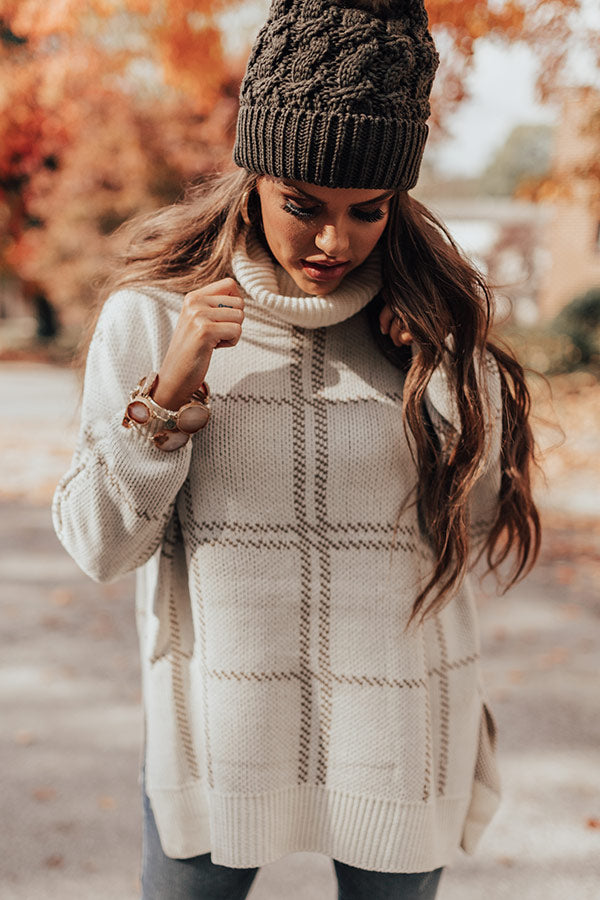 Enjoy a cozy little getaway in style and warmth with this charming neural tunic sweater featuring soft and thick tight knit material patterned with an oversized plaid print, a rolled turtle neckline, long loose sleeves with fitted cuffs, and a relaxed silhouette that cascades into a straight upper-thigh length hemline with accent side slits! Measurements