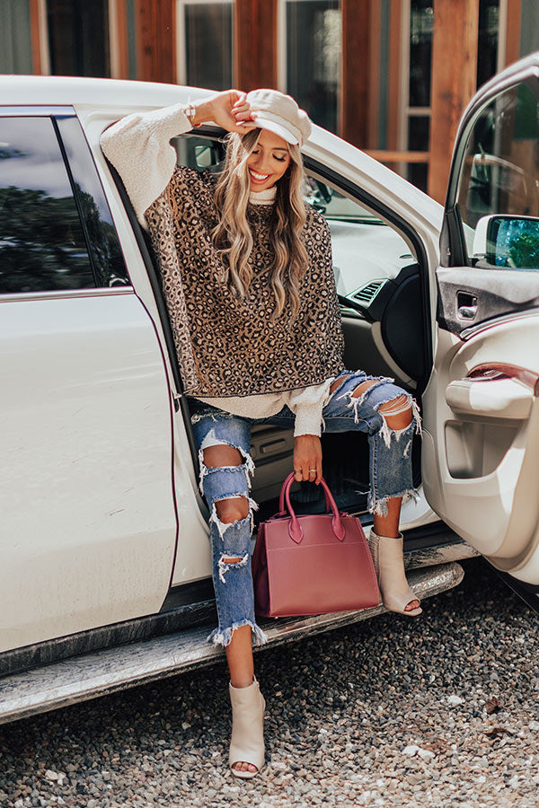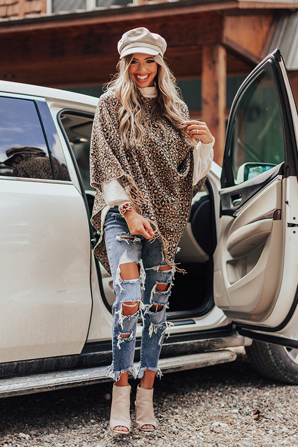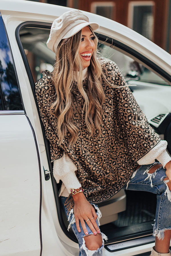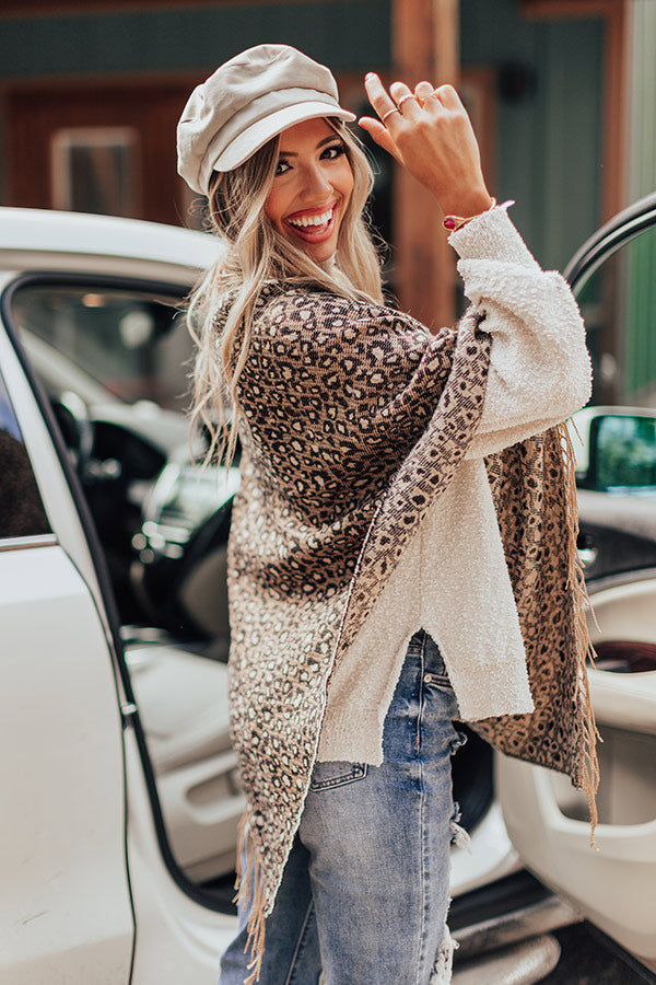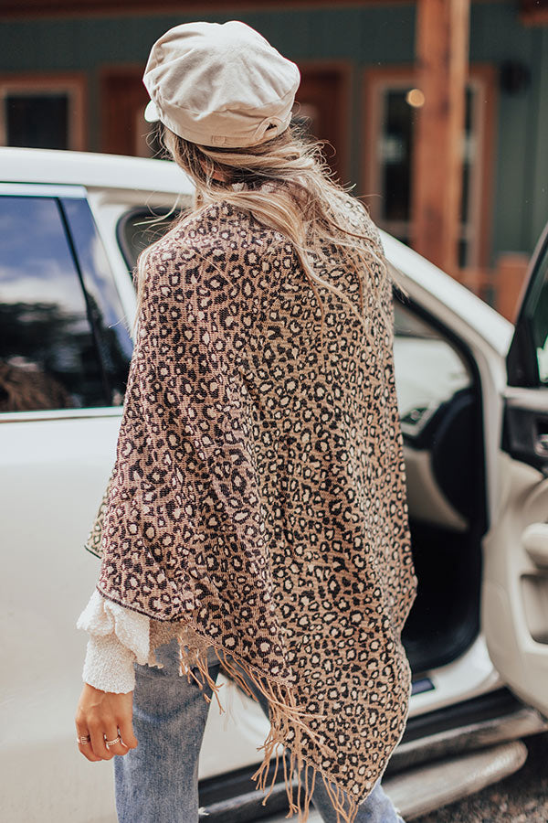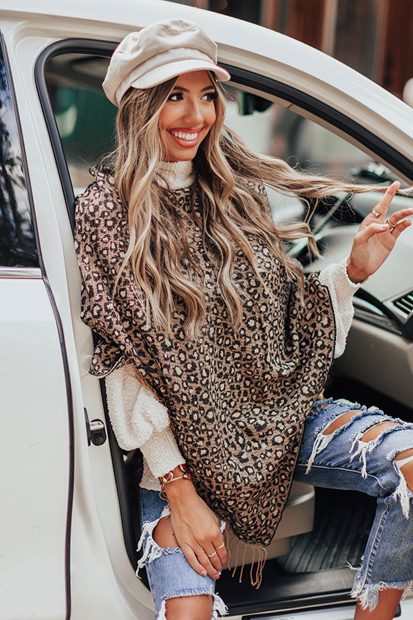 Layer up in style with our gorgeous brown "Cozy Lodge" poncho featuring soft lightweight tight knit material patterned with a black and cream hued leopard print, a high rounded neckline, and an ultra draped silhouette with open sides and a pointed hemline with tassel trim detailing!