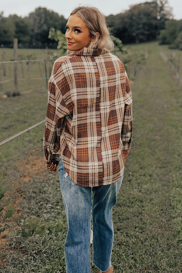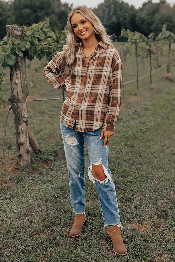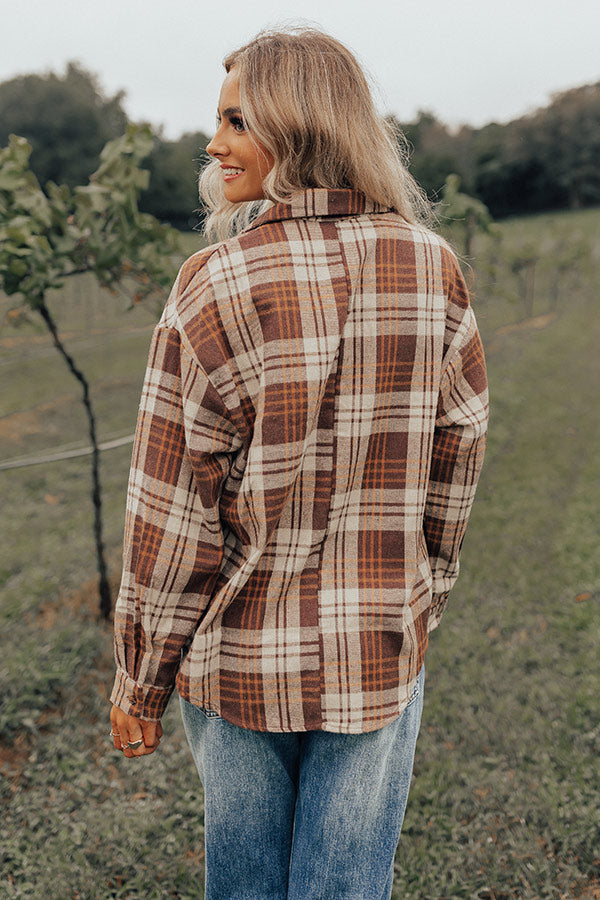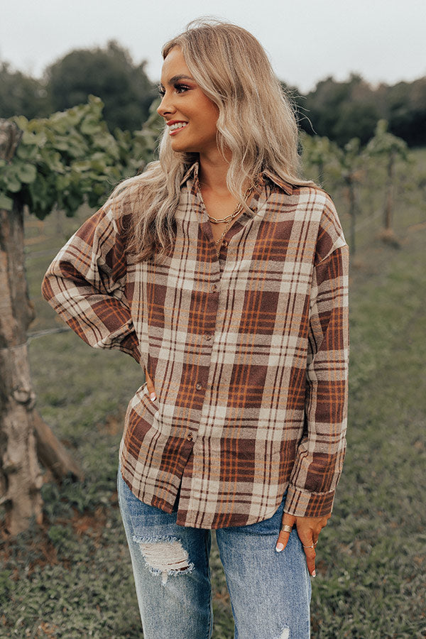 Keep cozy in this fall staple featuring lightweight material patterned with a chocolate colored plaid print, a button down front with a collared neckline, long loose sleeves with button closure cuffs, and a relaxed silhouette that falls into a rounded hemline!