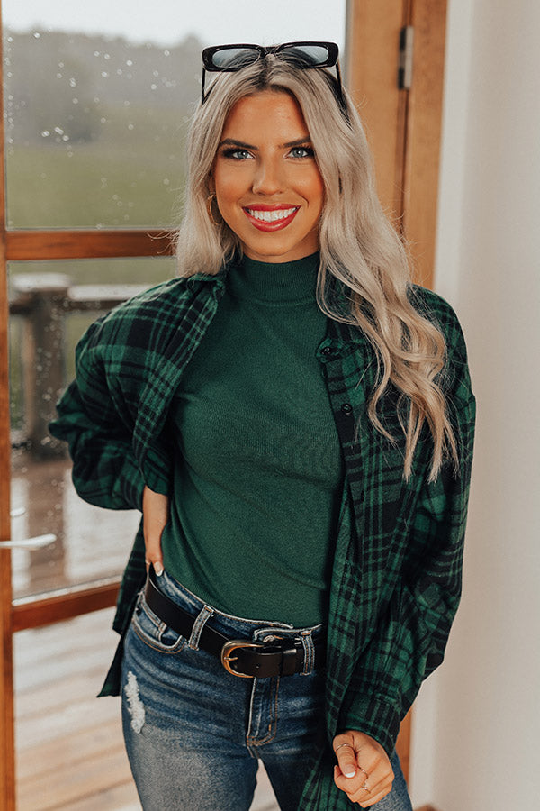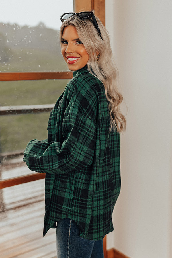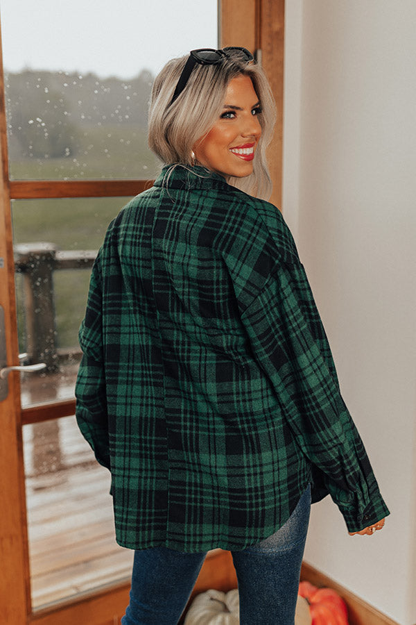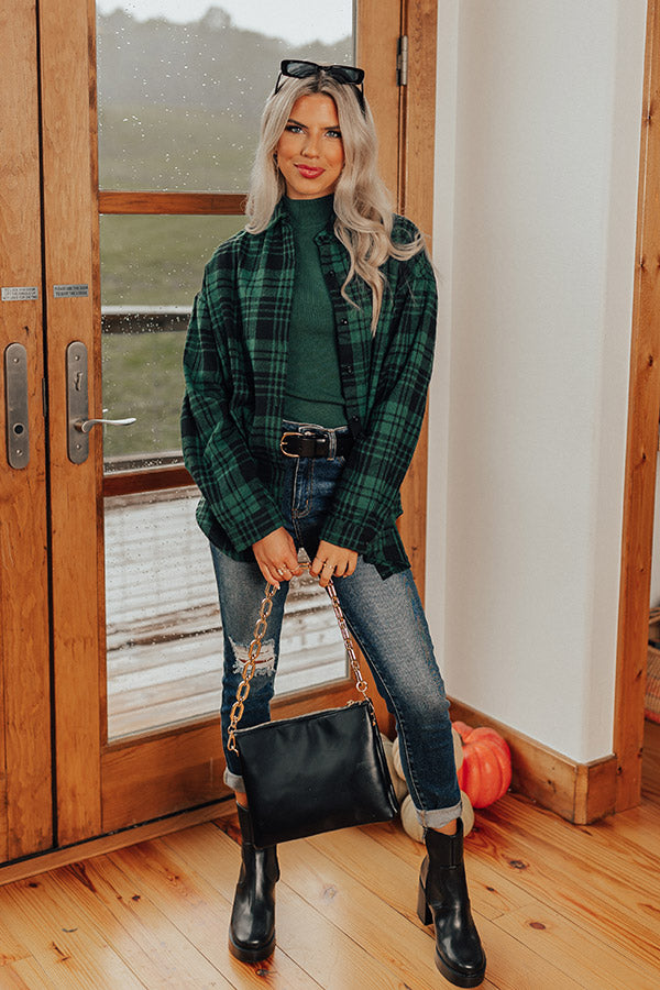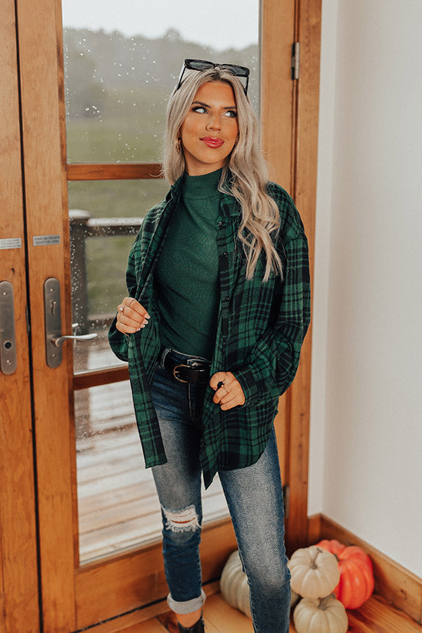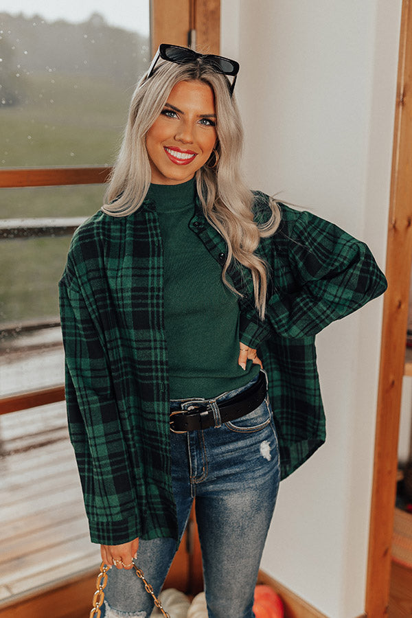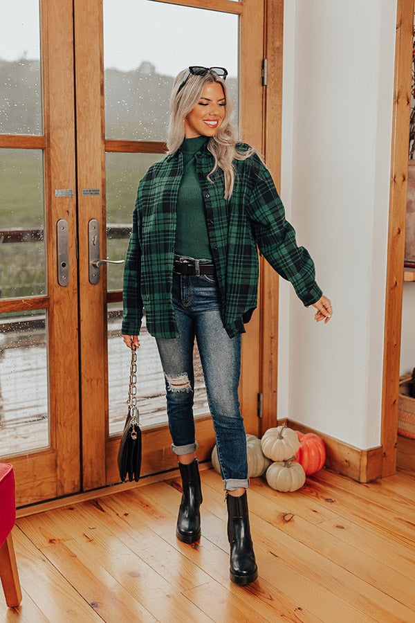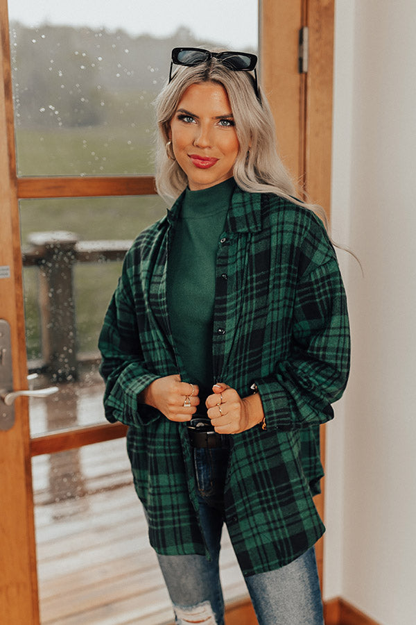 Keep cozy in this fall staple featuring lightweight material patterned with a hunter green colored plaid print, a button down front with a collared neckline, long loose sleeves with button closure cuffs, and a relaxed silhouette that falls into a rounded hemline!