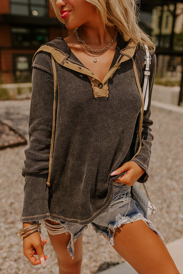 Cozy Moment Waffle Knit Hoodie in Vintage Black