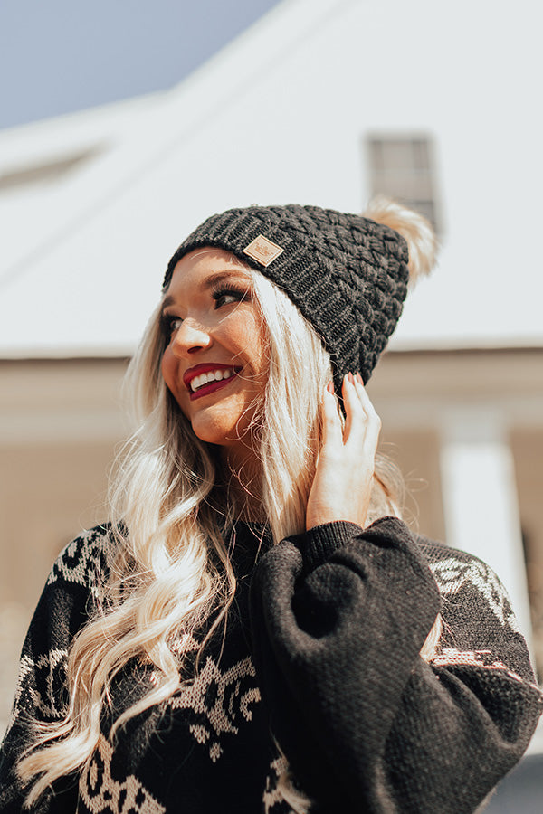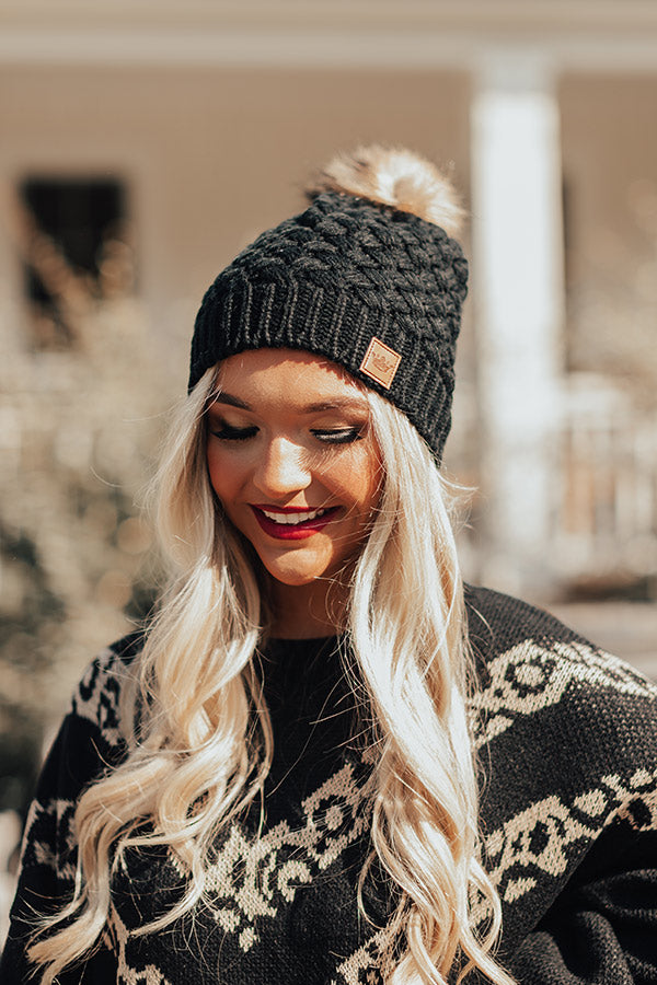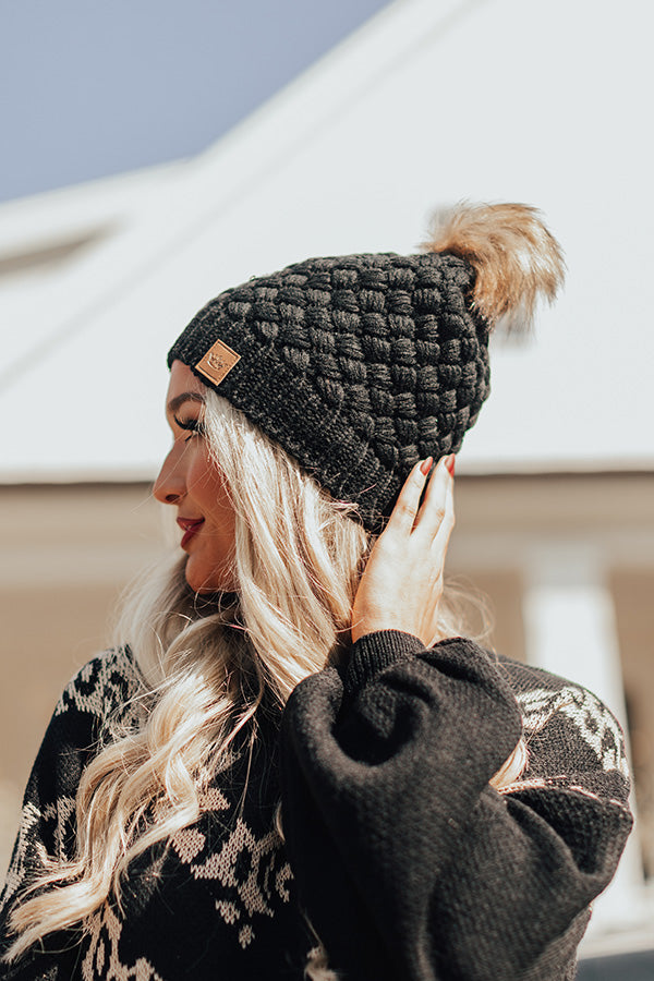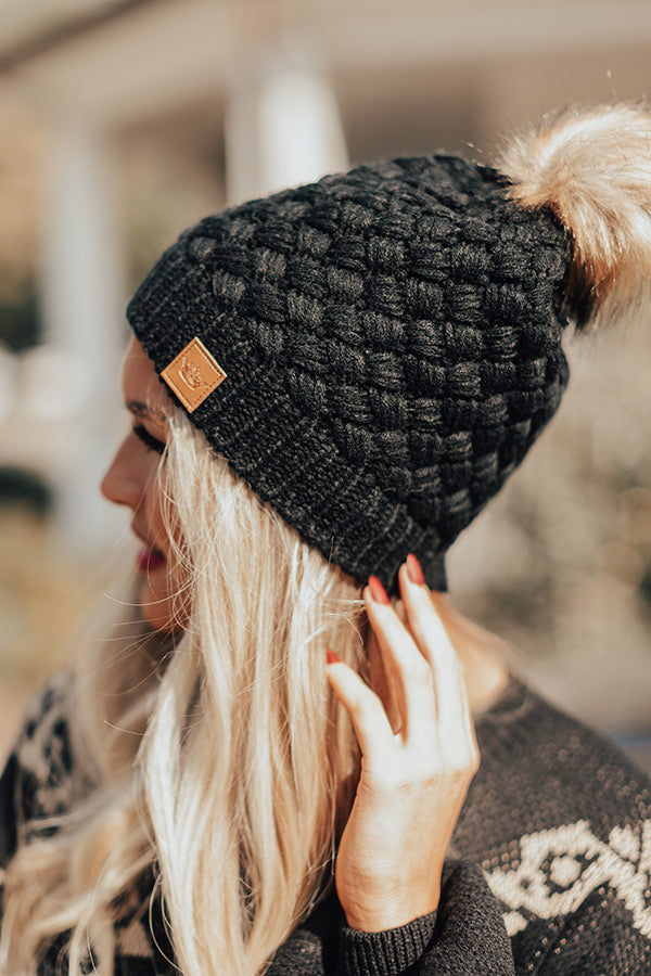 You are sure to be in a "cozy mood" when you keep warm with this adorable black beanie featuring soft lightweight checkered knit material with fleece lining and a faux fur pom accent!
