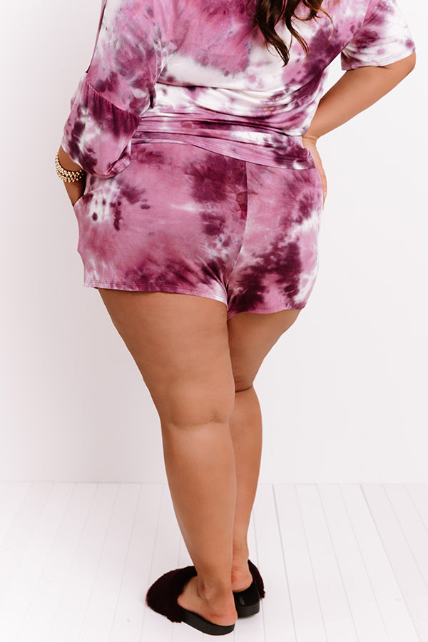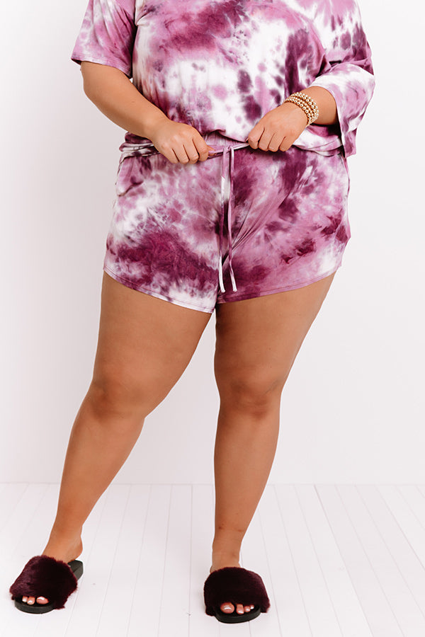 Plus Size - Our adorable 'Cozy Snapshot' shorts are the upgrade your lounge wear has been asking for with their ultra soft lightweight material patterned with purple hued tie dye, a wide elastic waistline with a tie belt, accent side pockets, and a relaxed silhouette that falls into straight upper-thigh length hemlines! Measurements