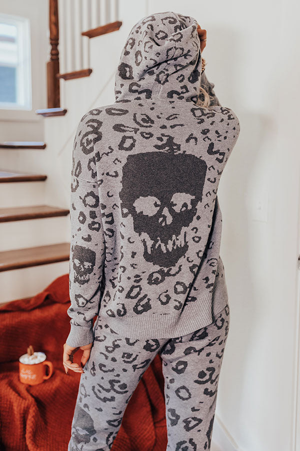 Sugar and spice, leopard and skulls, and everything nice! This cozy hoodie features long sleeves, a hoodie with adjustable ties, leopard print, skull print on the elbows, and front hoodie pocket. Pair this hoodie with our 'Cozy Surrounding Leopard Joggers' and 'Mask' for a complete look.