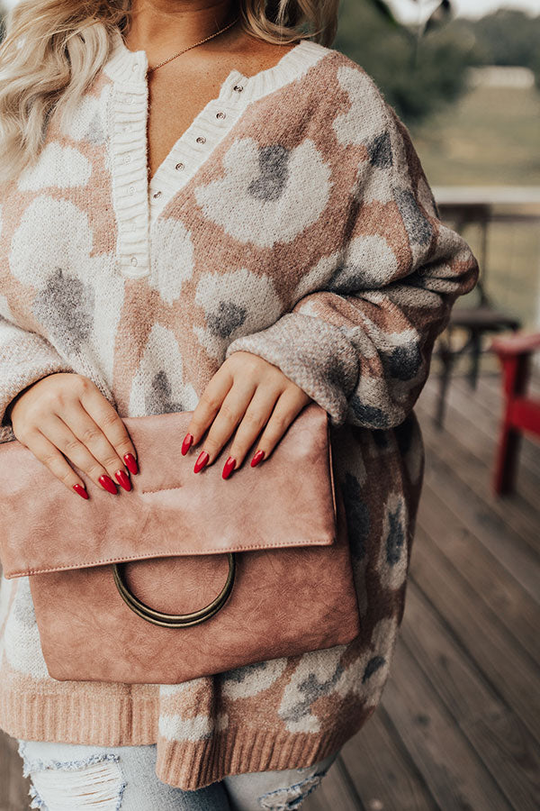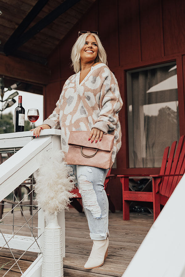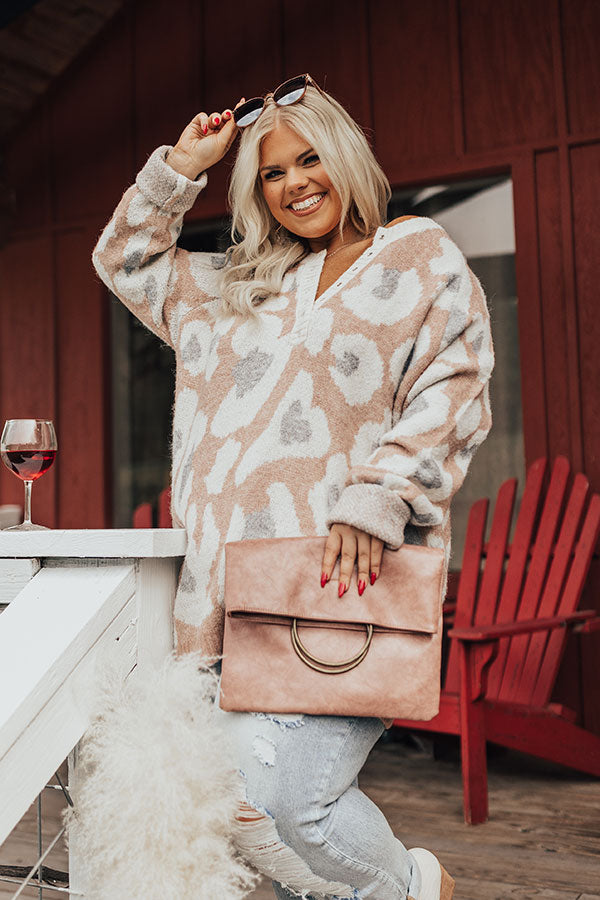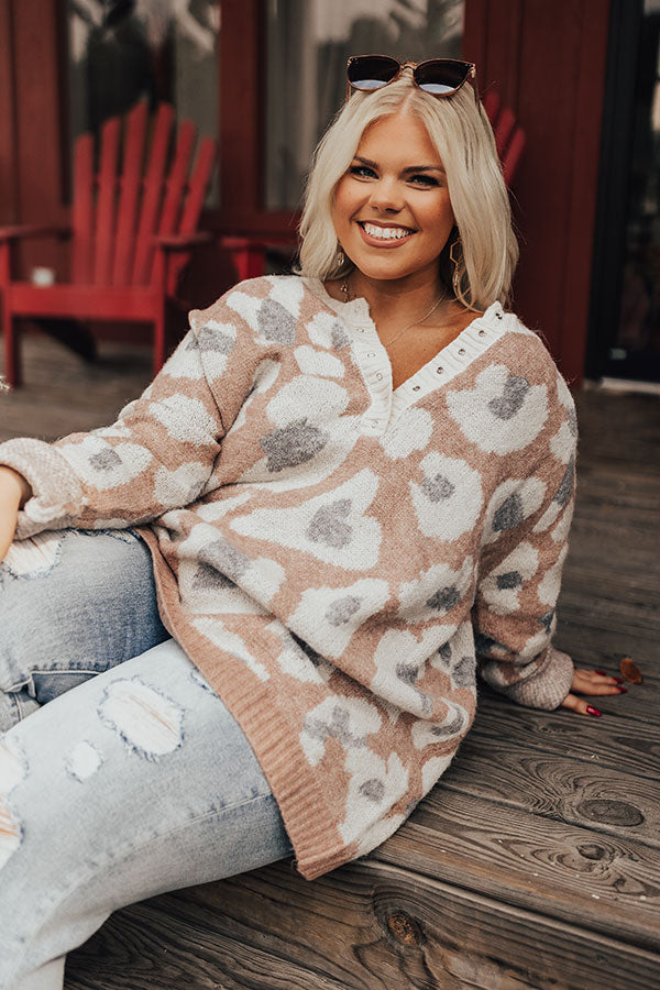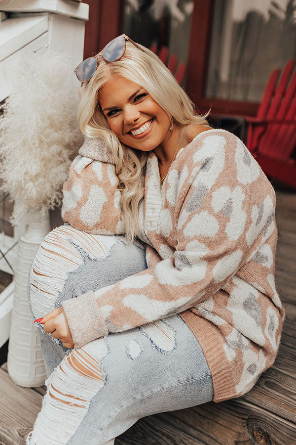 Plus Size - Keep cozy all winter long in this darling iced latte colored sweater featuring soft knit material pattered with a brown hued leopard print, a button up bodice with a rounded neckline, ribbed trim detailing, long loose sleeves, and a slouched silhouette that falls into a straight hemline! Measurements