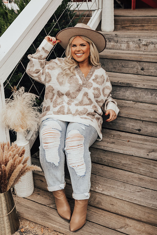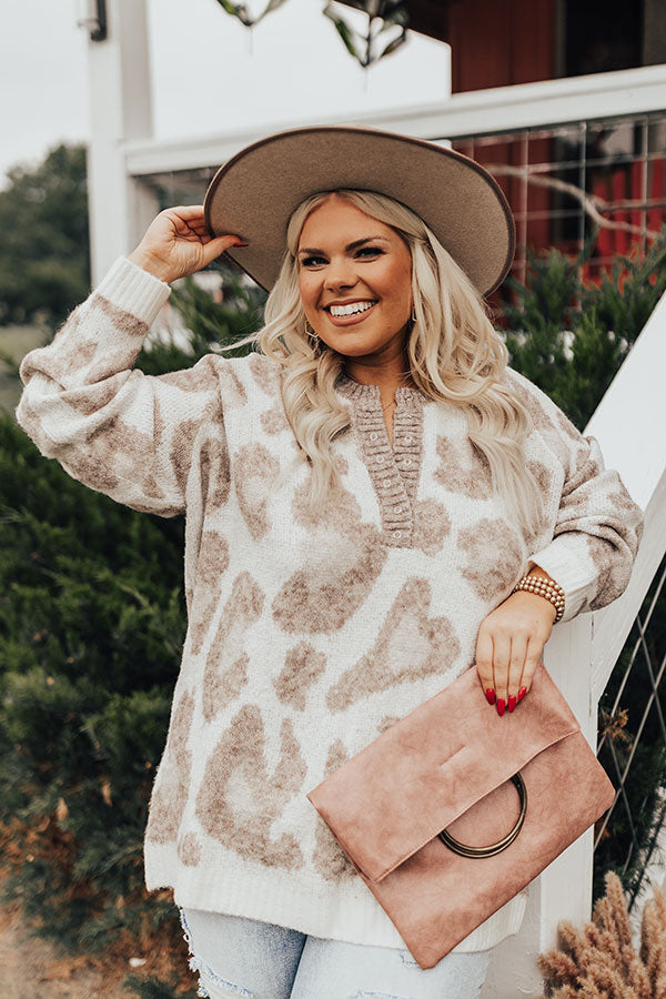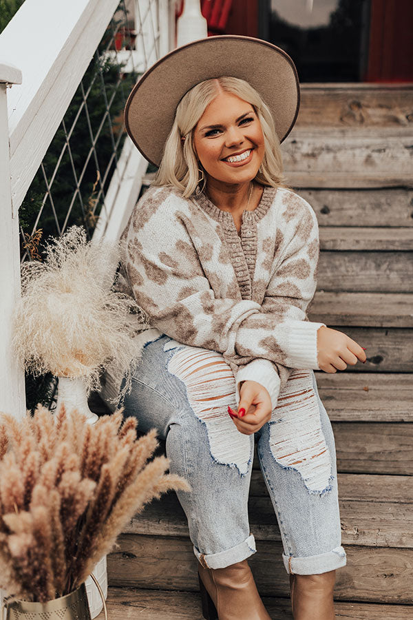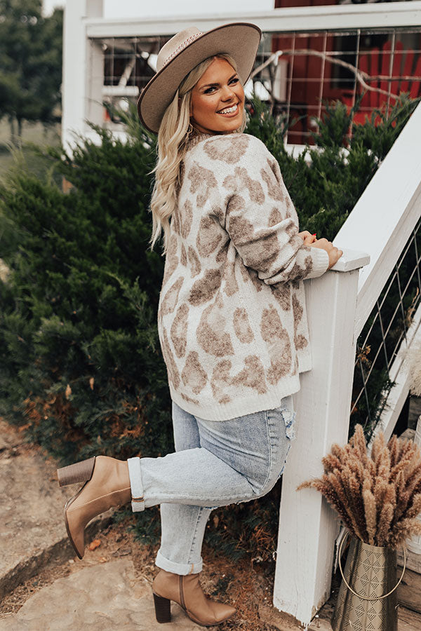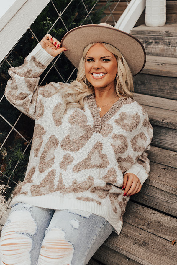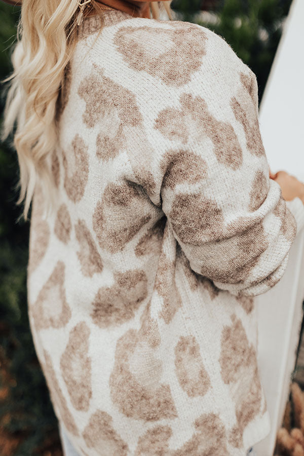 Plus Size - Keep cozy all winter long in this darling ivory colored sweater featuring soft knit material pattered with a brown hued leopard print, a button up bodice with a rounded neckline, ribbed trim detailing, long loose sleeves, and a slouched silhouette that falls into a straight hemline! Measurements
