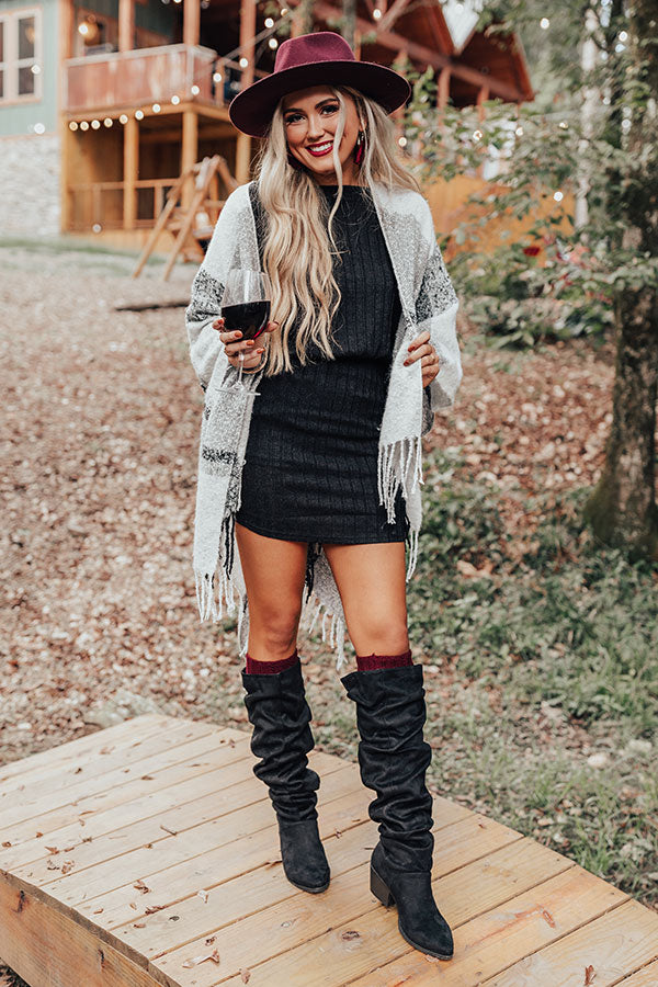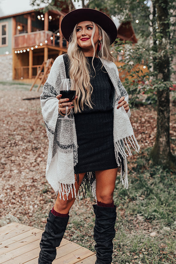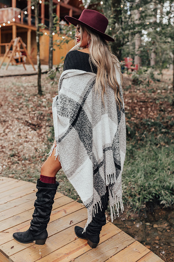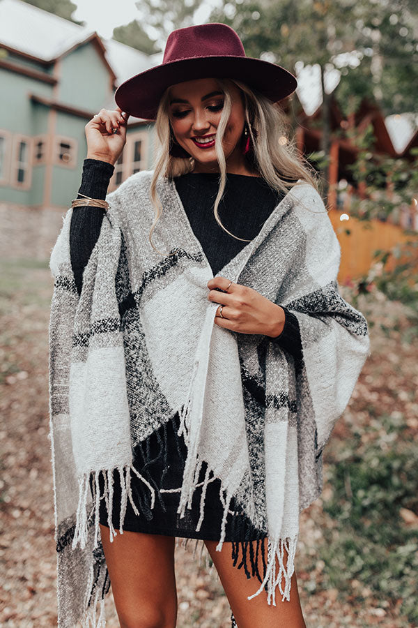 "Cozy up" by the fireside in this gorgeous poncho featuring soft lightweight tight knit material patterned with a large grey, black, and white plaid print, an ultra draped silhouette with open sides, and an uneven mid-thigh length hemline with long tassel trim detailing!