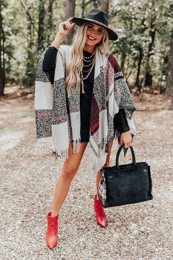"Cozy up" by the fireside in this gorgeous poncho featuring soft lightweight tight knit material patterned with a large red, black, and white plaid print, an ultra draped silhouette with open sides, and an uneven mid-thigh length hemline with long tassel trim detailing!